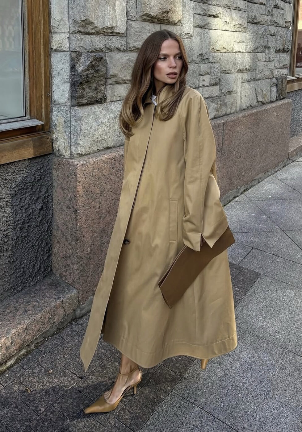가을하면 빠질 수 없는 베이지 트렌치코트를 더욱 가을스럽게, 분위기를 살려 입고 싶다면 백과 슈즈 또한 브라운 톤으로 통일해 보세요. 아이템의 스타일에 따라 무드를 달라집니다. 하이엔드 스타일의 드레시한 스타일에는 포인티드 힐과 미니멀한 디자인의 심플한 클러치 백이 제격이죠.