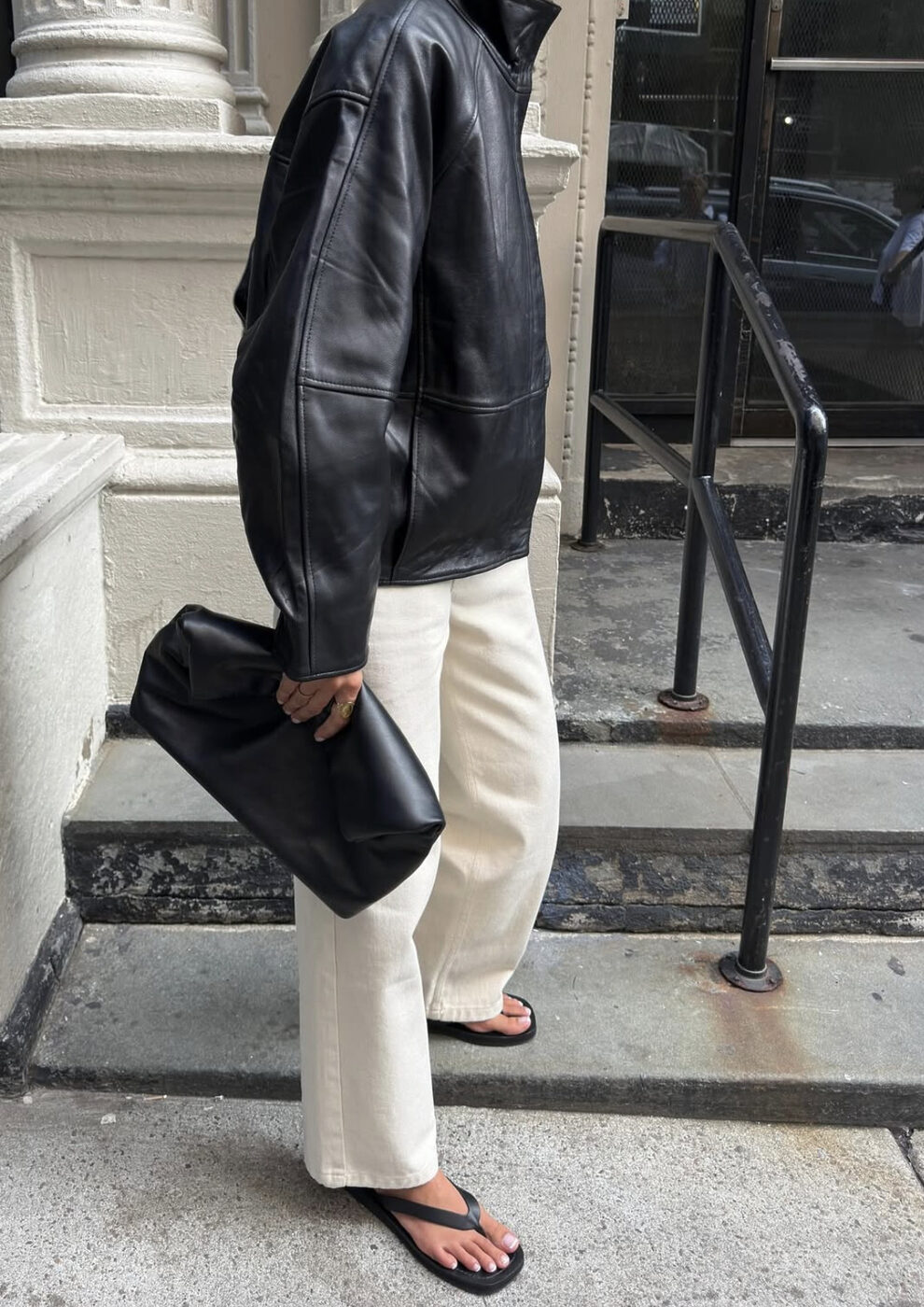 좀 더 시크하고 캐주얼한 무드의 레더 재킷에도 이 블랙 레더 클러치 백은 유용합니다. 부드러운 소재의 사이즈가 큰 클러치 백일수록 웨어러블하고 실용적인 스타일링이 가능하죠. 레더 재킷에 화이트 팬츠와 블랙 플립플롭과 백으로 심플하고도 힘있는 모노 톤 룩을 선보였어요.