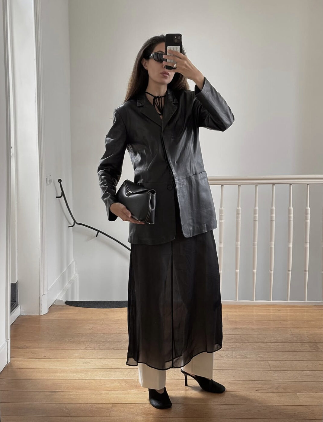 봄버나 오버사이즈 실루엣이 아닌 슬림한 테일러드 핏의 블랙 레더 재킷을 뻔하지 않게 입는 법. 바로 롱 실크 드레스와 팬츠의 레이어링를 활용하는 거예요. 그 위에 레더 재킷으로 에지를 더했다면 백은 같은 블랙 레더 소재의 클러치 백을 들어주세요. 도도하고 고급스러운 분위기를 냅니다.