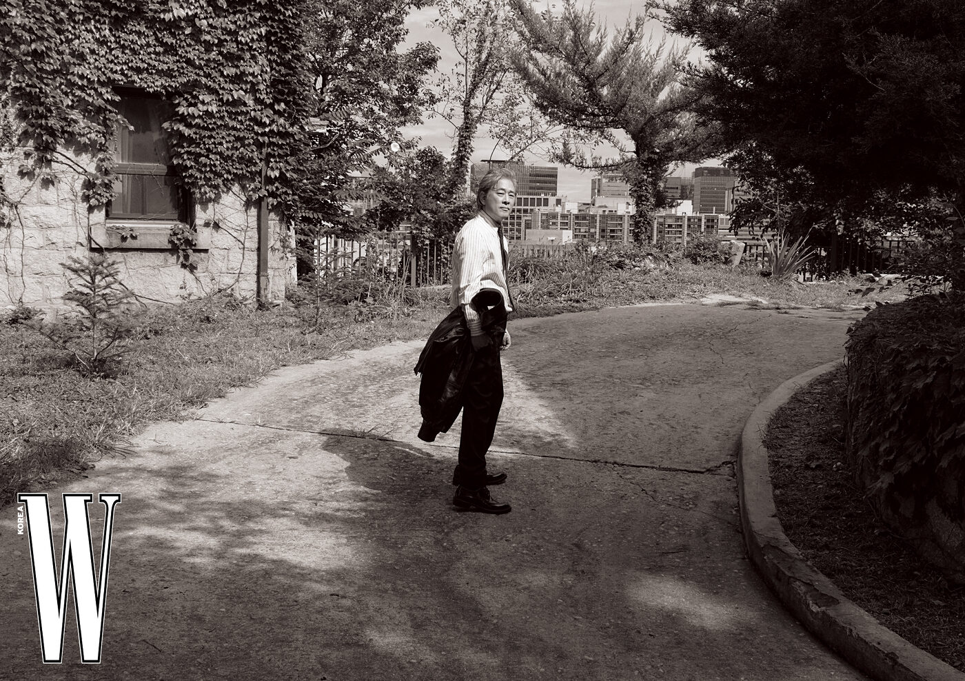 박찬욱 감독은 화보 모델로서의 임무를 마친 후, 느릿한 속도로 걸어 다니며 주변을 탐색하기 시작했다. 손에 든 라이카카메라 외에 두툼한 검정 배낭에도 두 대의 카메라가 더 들어 있었다. 이제 그가 해야 할 또 하나의 역할은 ‘사진가’였다. 매거진 화보 촬영장이란 에디터들의 욕심과 화보 주인공의 재능이 맞아떨어지며 화학 작용을 일으키는 곳이다. 주인공 중 하나가 박찬욱이라면, 그를 카메라 앞에만 세우는 건 직무 유기처럼 느껴진다. 영화 <아가씨>와 <헤어질 결심>의 배우들 및 작업 여정을 담은 사진집을 낸 것은 물론, 국제갤러리 소속 작가로서 개인전을 열기도 한 그에게 사진은 진지한 이야기다. 무엇보다 오늘이 특별한 이유는 영화 <어쩔수가없다>를 구성하는 여러 배우 중에서도 손예진과 감독이 함께하는 이 ‘투 샷’의 귀함에 있다. 영화 촬영장을 벗어난 두 사람은 따로 또 같이, 화보의 주인공으로 섰다. 그리고 손예진은 안주영과 박찬욱, 두 사진가의 눈을 통해 서로 다르게 포착되었다. “장소가 좋은데, 갑자기 해가 들어가버린게 조금 아쉽네요.” 박찬욱이 말했다. 조금 전까지 쨍쨍하던 해가 눈 몇 번 깜빡한 사이 사라져버린 건 기이한 일이다. 카메라를 든 사람 속이야 어떨지 모르지만, 무심한 얼굴로 낯선 아름다움을 보여주는 손예진의 무드와 불현듯 스산해 보이는 풍경, 그리고 박찬욱은 서로 잘 어울리는 조합이다. 9월 24일이면 <어쩔 수가없다>가 개봉한다. 한동안 기쁜 소식이라고는 드물었던 한국 영화계에 잔칫날처럼 반가운 기운을 몰고 온 영화다. 다 이루었다는 생각이 들 만큼 삶에 만족하던 중산층 가장이 돌연 해고 통보를 받으면서 벌어지는 필사의 생존극. 영어 제목으로는 되겠다. 나와 내 가정이 몰락하지 않으려면 어쩔 수 없이 경쟁자들을 제거해야 한다지만, 정말 그 선택 말고 다른 길은 없었던 걸까? 박찬욱 감독이 만든 이 통렬한 블랙코미디는 82회 베니스국제영화제와 50회 토론토국제영화제를 거치며 온도가 달아올랐고, 토론토에서 ‘국제 관객상’을 수상했다. 9월 17일에는 30회 부산국제영화제의 개막작으로 한국에 처음 공개된다. 꿈꾼 것처럼 정신없이 롱 테이크의 나날을 보내고 서울에 돌아온 박찬욱이, 잠시 숨을 고른다.