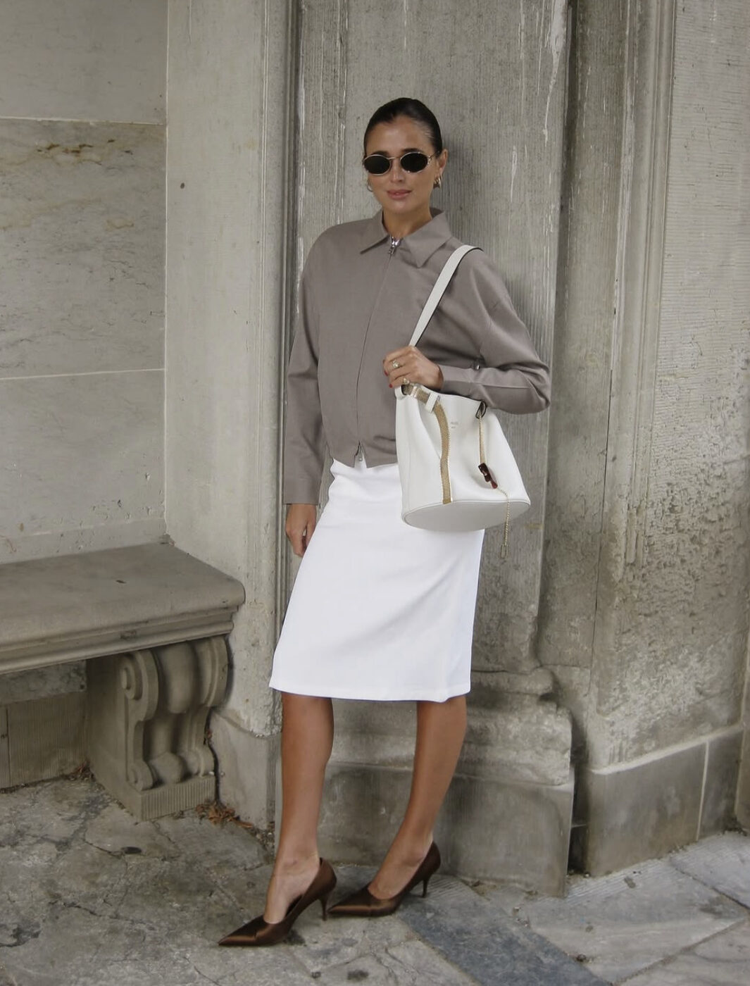 여기에 트렌디함을 더한다면 캐주얼한 스타일의 봄버 재킷을 활용해 보세요. 지퍼를 채운 베이지 재킷와 브라운 하이힐 사이에 새하얀 펜슬 스커트가 독보적입니다. 여기에 화이트 숄더 백까지 더해 스커트를 더욱 돋보이게 만들어 주었어요.