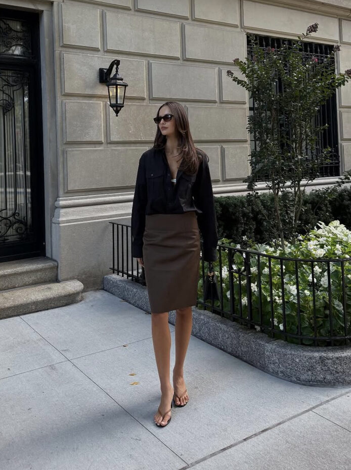 블랙 셔츠에 브라운 스커트로 안정적이지만 가을 느낌 물씬 하는 스타일도 선보였죠.