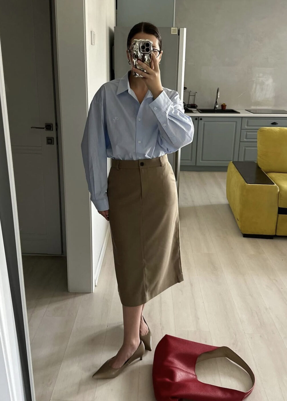 스트리트에서는 좀 더 웨어러블한 실용적인 스타일을 선보였어요. 펜슬 스커트와 언제나 절대적인 궁합을 이루는 셔츠의 매칭이 그렇습니다. 평범한 블루 셔츠에 베이지 컬러의 스커트와 펌프스를 신어 스타일리시한 조화를 이뤘어요.
