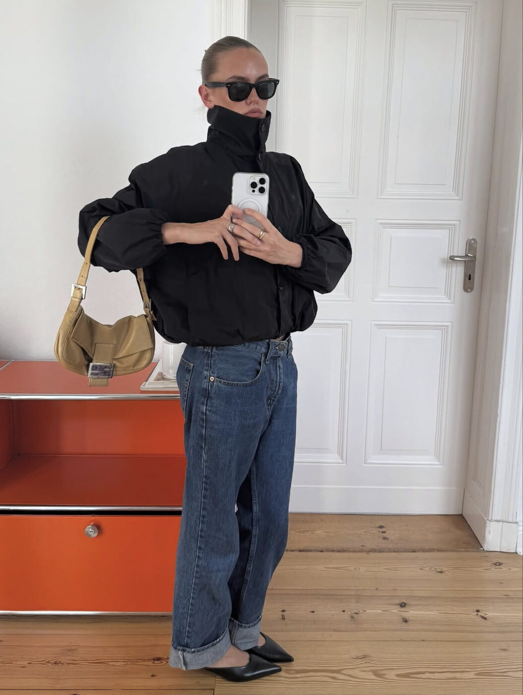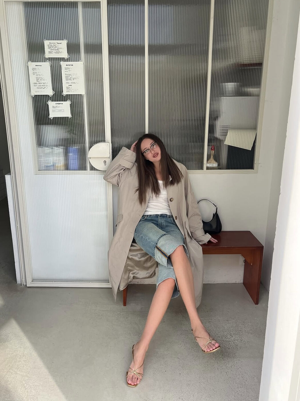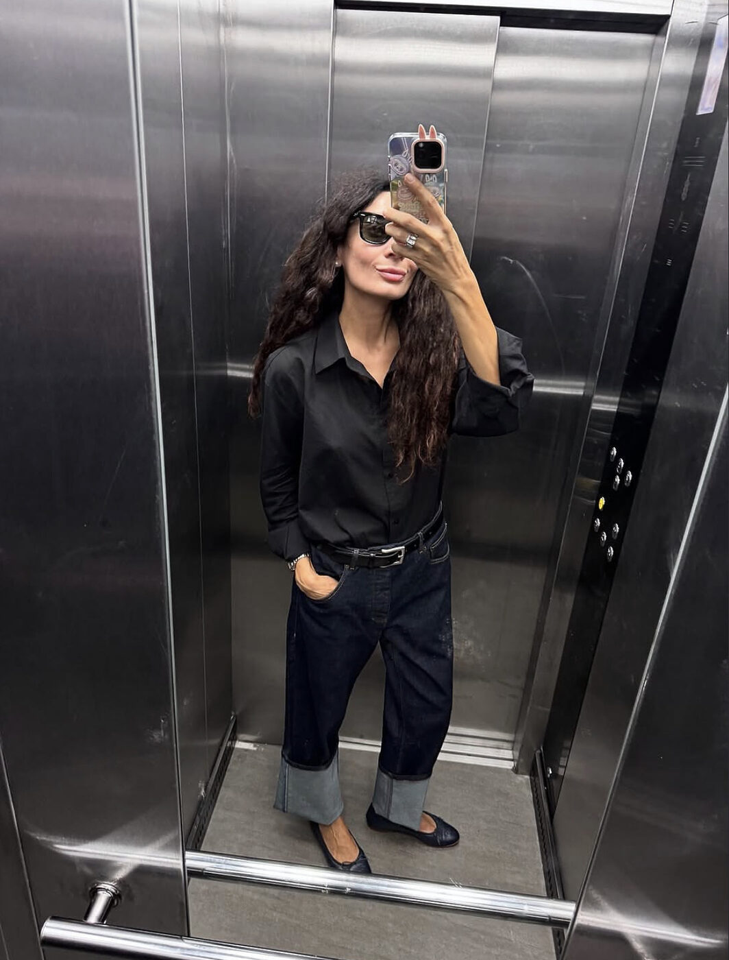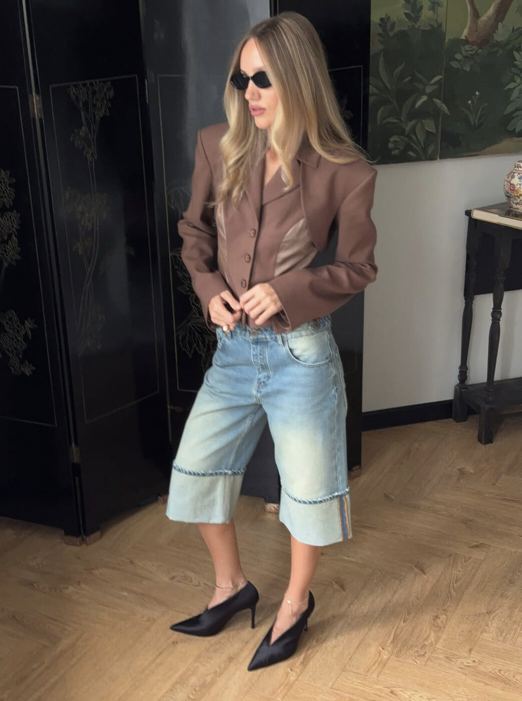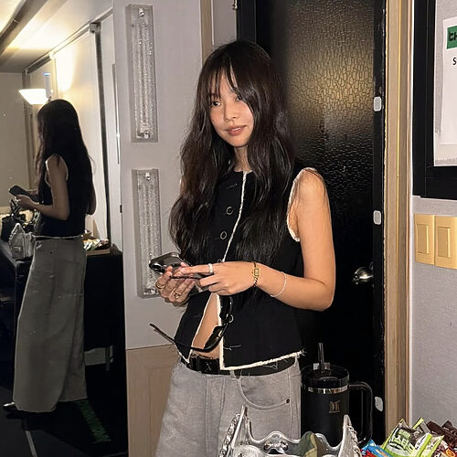 블랙 셔츠에 진청 데님을 입은 이 룩도 마찬가지입니다. 특히 낮은 굽의 신발과 매치할 땐 밑단이 발등을 덮지 않게 하는 게 중요해요. 자칫 너무 답답해보일 수 있기 때문에 경쾌한 포인트는 남겨줘야합니다.