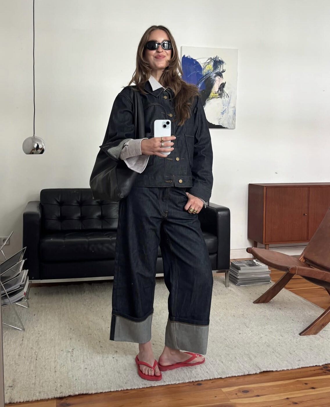 물론 기장 조절을 위해서도 롤업을 했을 겁니다. 하지만 단순히 길이 때문이 아니라는 것을 알 수 있어요. 와이드한 생지 데님에 플립플롭을 신은 이 룩을 보세요. 생지 데님처럼 바삭거리는 원단은 각 잡기가 애매한데 그 뻣뻣한 맛이 롤업할 때 힘을 발휘합니다. 굵게 접은 밑단 덕분에 플립플롭이 데님과 대조돼 더 경쾌해 보이기도 하고요. 안감의 색 대비가 룩 전체에 포인트를 주네요.