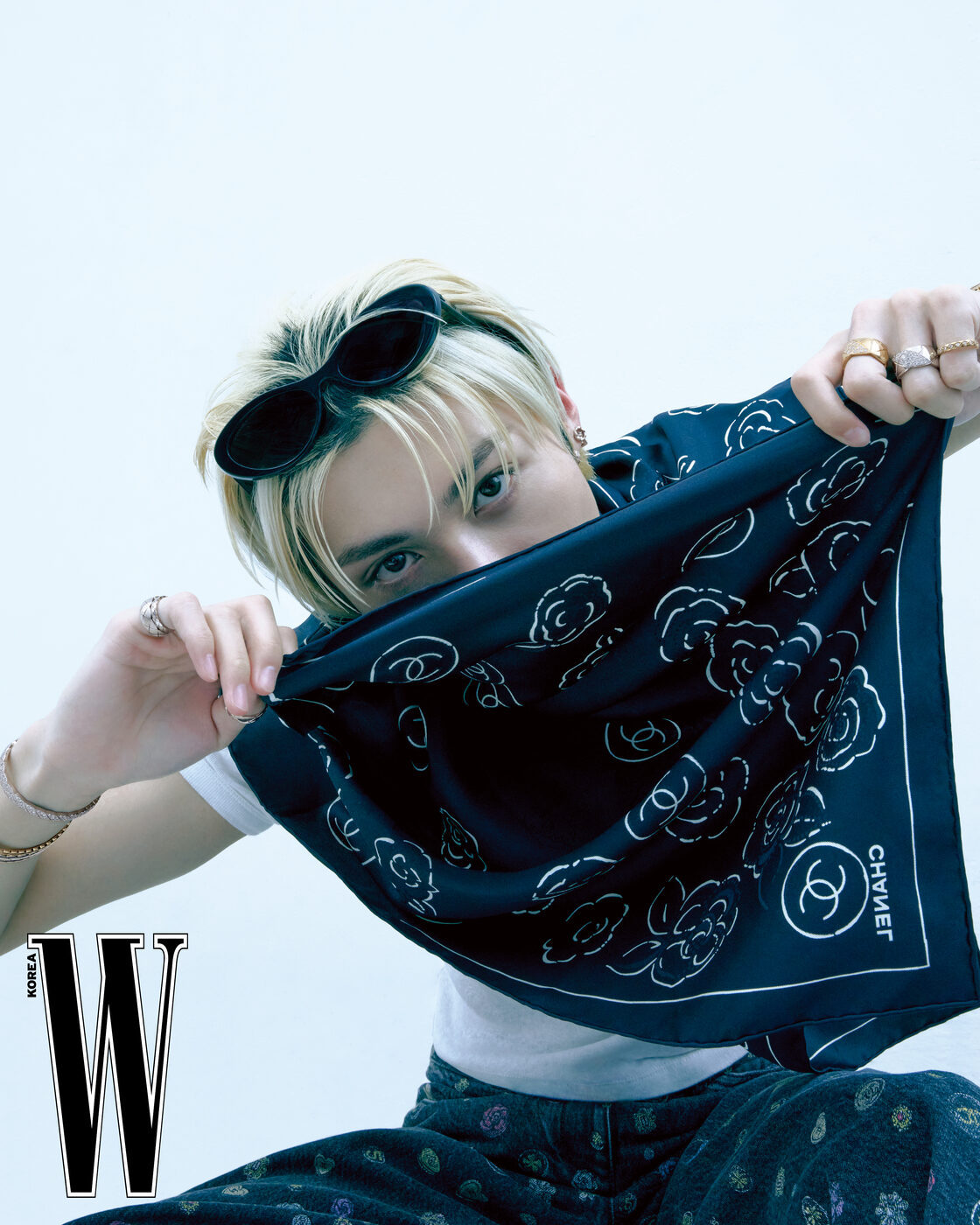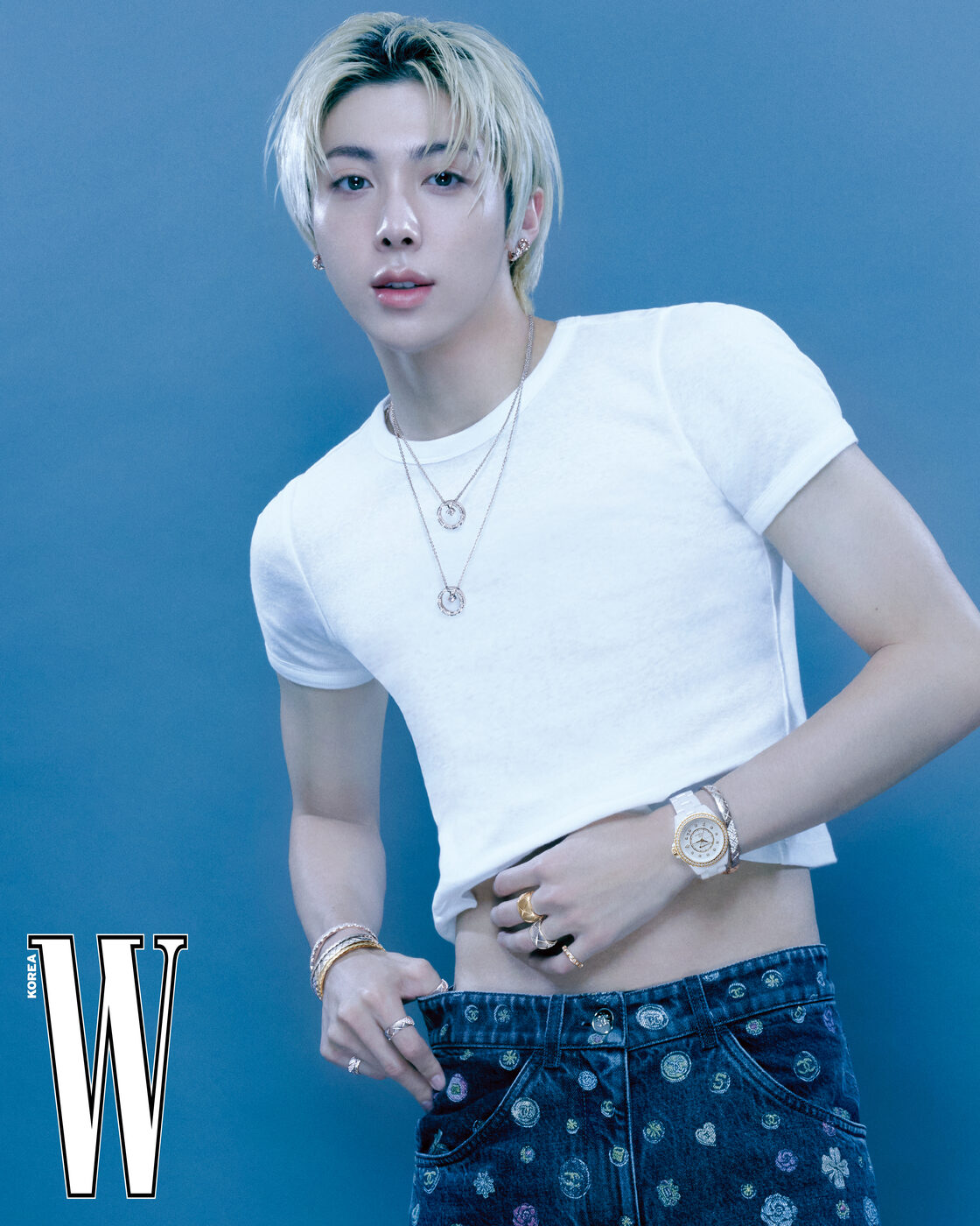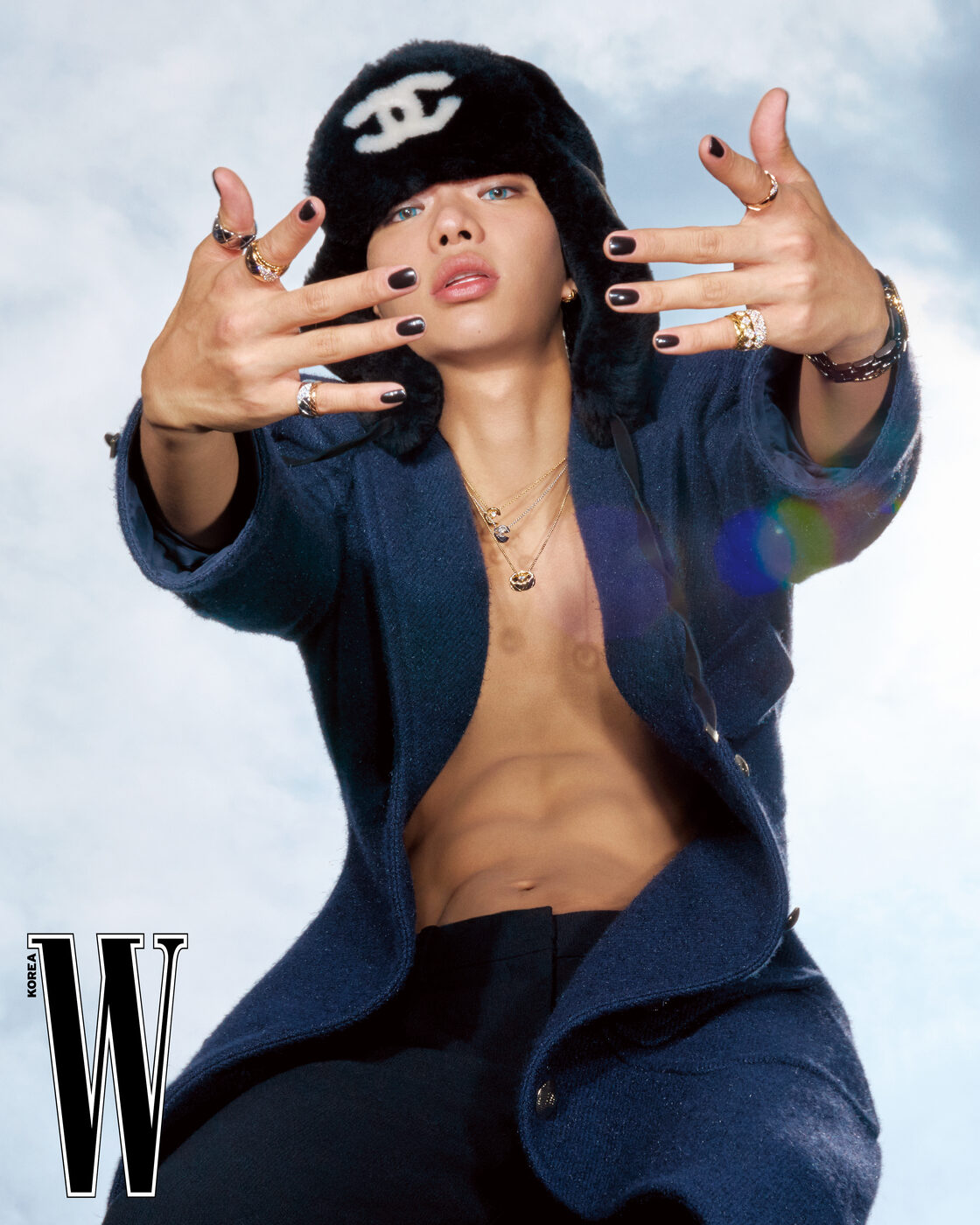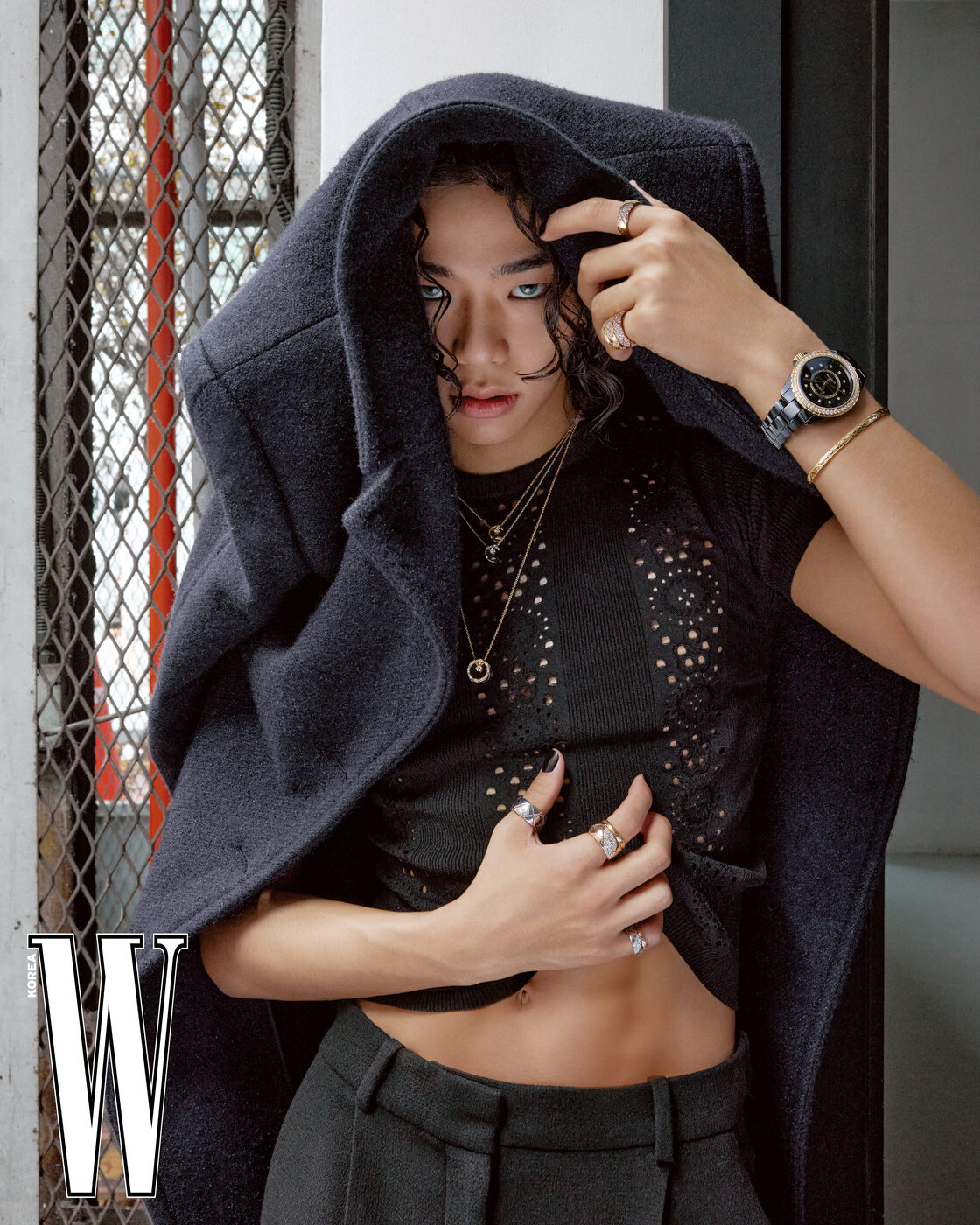 우찬이 착용한 18K 화이트 골드와 다이아몬드로 이루어진 네크리스, 18K 베이지 골드와 다이아몬드로 이루어진 싱글 이어링과 이어링, 레이어드해 착용한 18K 화이트 · 베이지 · 옐로 골드와 다이아몬드로 이루어진 미니 · 스몰 · 라지 링, 레이어드해 착용한 18K 화이트 · 베이지 · 옐로 골드와 다이아몬드로 이루어진 미니 브레이슬릿과 브레이슬릿은 모두 코코 크러쉬 컬렉션으로 CHANEL Fine Jewelry 제품. 화이트 세라믹과 18K 옐로 골드, 다이아몬드로 이루어진 J12 워치는 CHANEL Watches 제품.