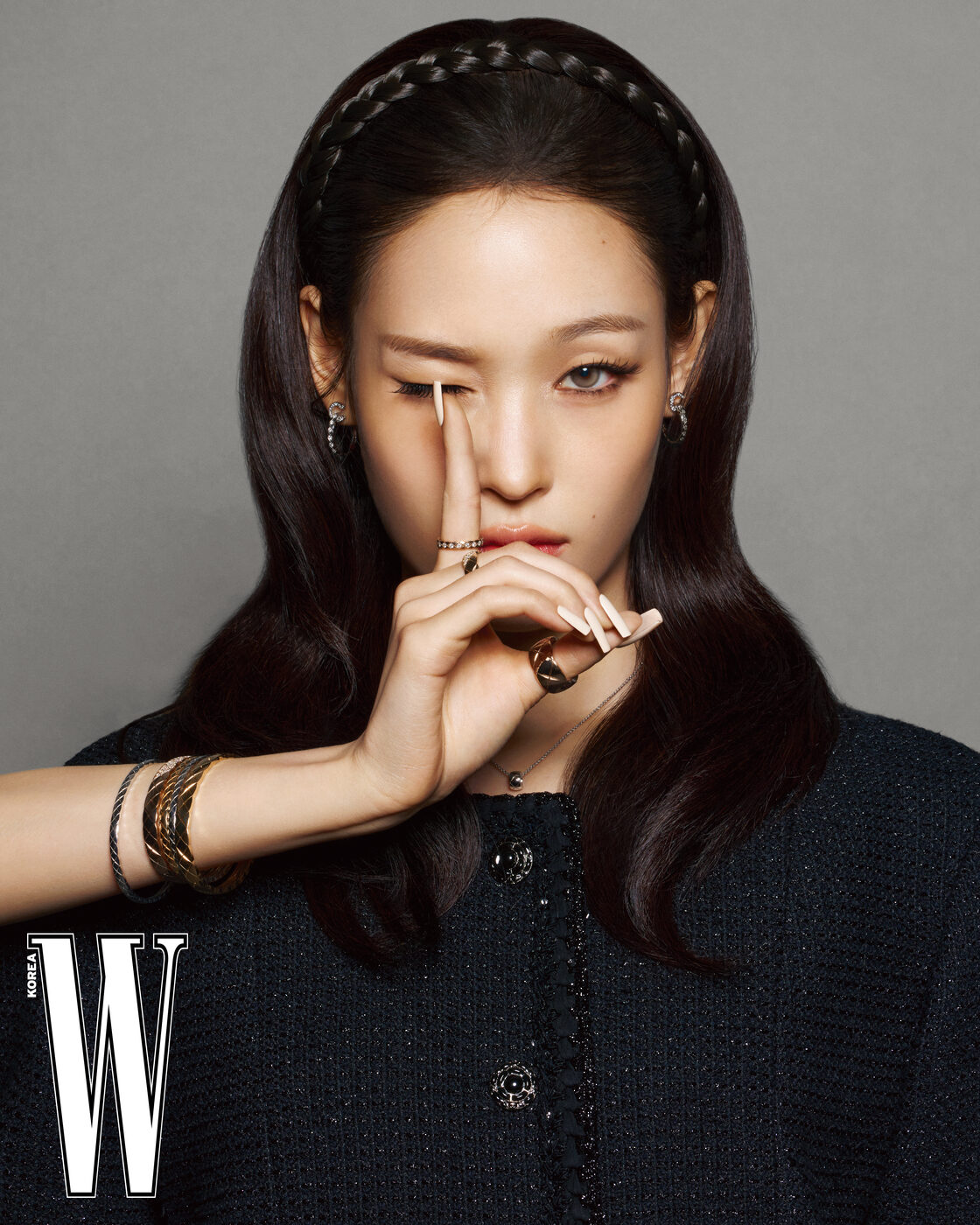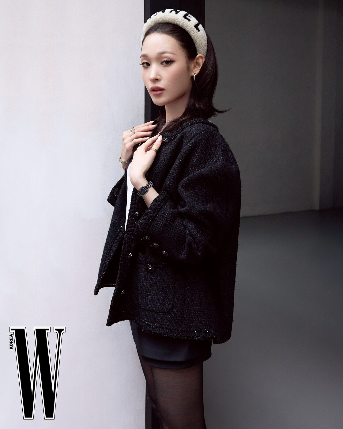 영서가 착용한 18K 화이트와 옐로 골드, 다이아몬드로 이루어진 후프 이어링과 싱글 이어링, 18K 화이트 · 베이지 · 옐로 골드와 다이아몬드로 이루어진 미니 · 스몰 링, 18K 화이트와 옐로 골드, 다이아몬드로 이루어진 미니 브레이슬릿과 브레이슬릿은 모두 코코 크러쉬 컬렉션으로 CHANEL Fine Jewelry 제품.