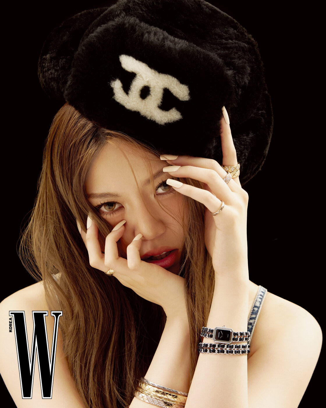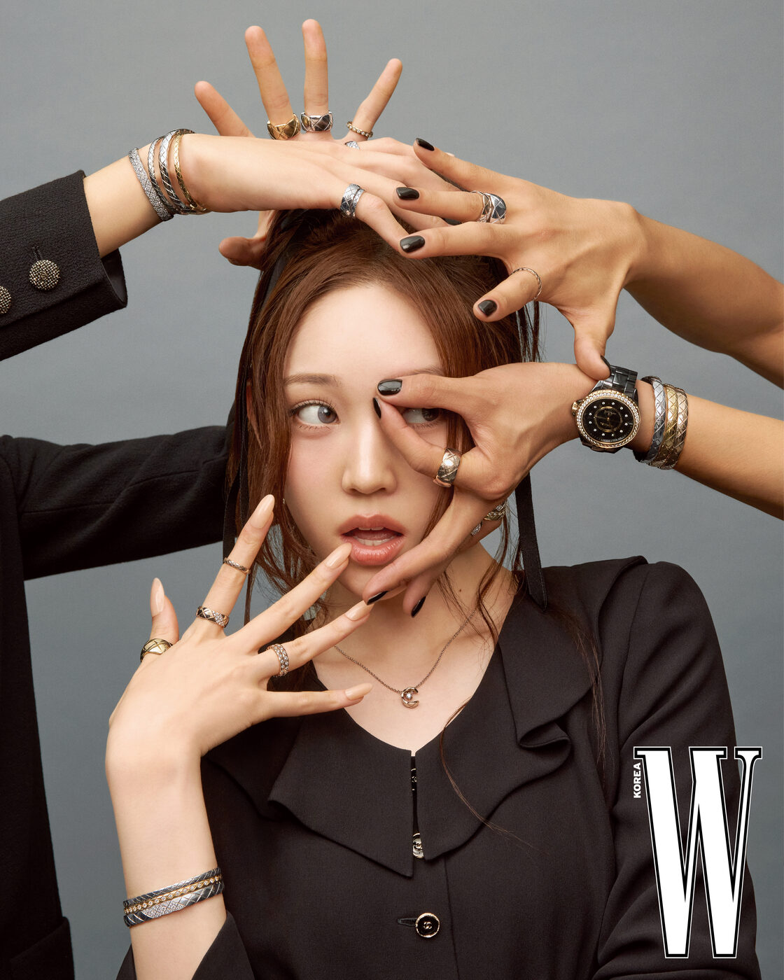 애니가 착용한 18K 화이트 골드와 다이아몬드로 이루어진 후프 이어링, 18K 화이트 · 옐로 · 베이지 골드와 다이아몬드로 이루어진 미니 · 스몰 링, 오른손에 착용한 18K 화이트 · 옐로 골드와 다이아몬드로 이루어진 미니 브레이슬릿은 모두 코코 크러쉬 컬렉션으로 CHANEL Fine Jewelry 제품. 왼손에 착용한 스틸과 블랙 가죽, 블랙 다이얼의 프리미에르 워치는 CHANEL Watches 제품.