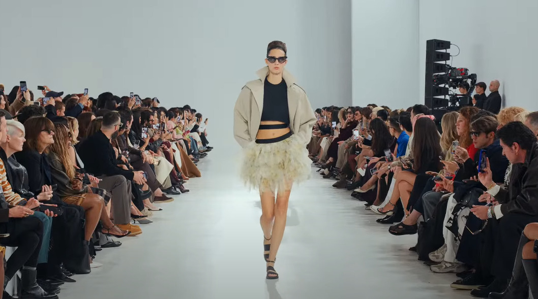 첫인상은 단단한 구조를 휘감는 유연함이었다. DJ 조니 다이넬(Johnny Dynell)이 클럽 비트와 실내악을 리믹스한 사운드가 울려 퍼지자, 완벽한 시뇽 헤어에 검은색 헤어밴드를 한 모델이 막스마라의 시그니처 카멜 코트를 입고 등장했다. 절제된 팔레트 위에 뜻밖의 오간자 레이어와 플로럴 패턴이 더해져 로맨틱한 분위기를 연출했다. 트렌치코트의 소매, 미디 스커트 허리에는 말린 꽃잎을 켜켜이 쌓아올린 듯한 오간자 아플리케와 러플을 풍성하게 더했다. 특히 오간자 패널을 더한 트렌치 재킷은 수채화처럼 번진 텍스처가 걸음을 따라 바람을 머금듯 일렁였다. 또 다른 키 룩으로는 와이드 라펠을 뒤로 젖혀 목선과 쇄골을 드러내는 재킷이 있었다. 단호한 구조 속에서 슬쩍 흘러나온 관능과 도발이 매력적이었다.