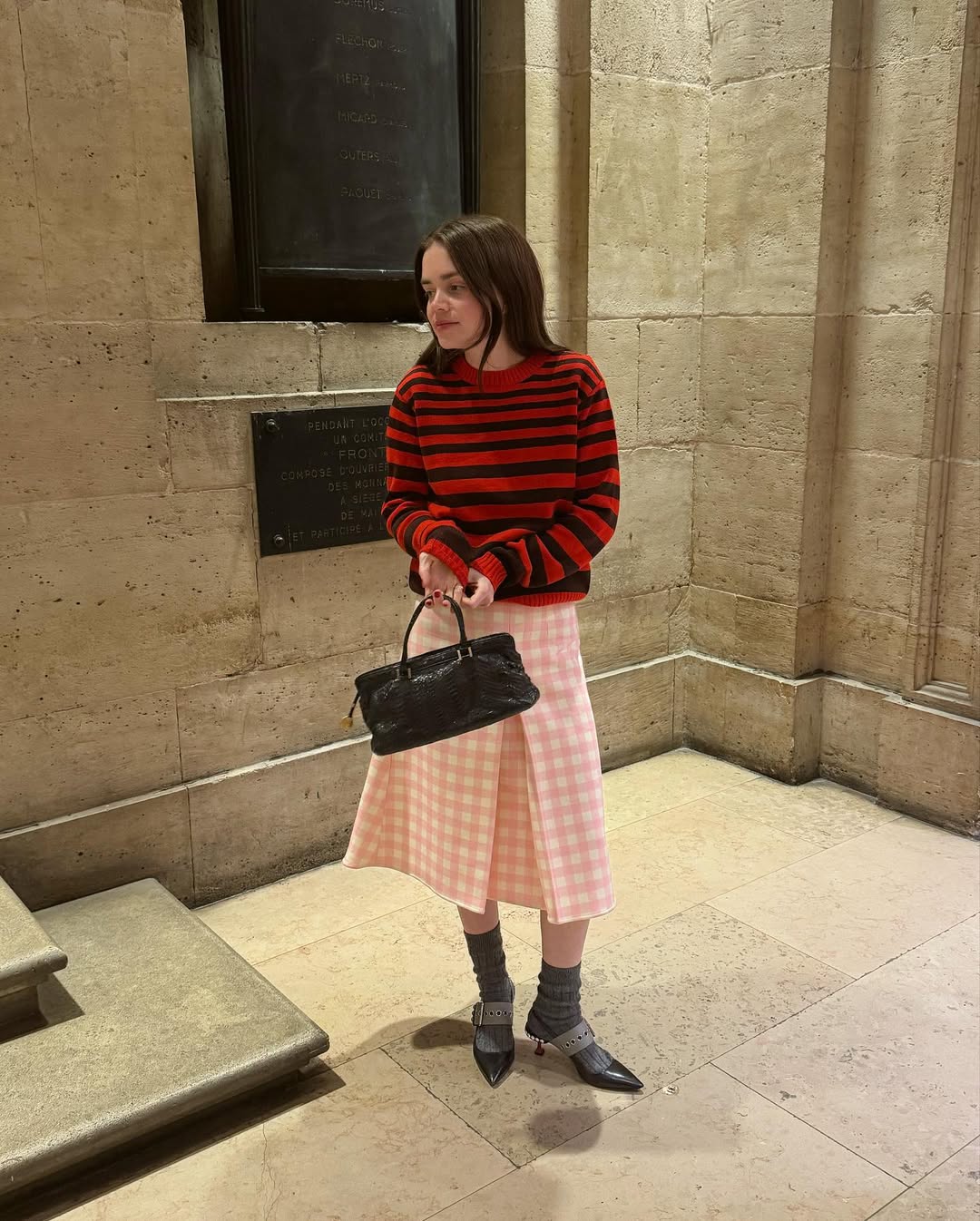 스트라이프 사이의 간격이 넓고 볼드해질수록 오히려 세련된 분위기가 연출됩니다. 스커트까지 체크 패턴이 들어간 아이템과 매치했지만, 상하의 패턴을 모두 큼직하게 맞춰주었기 때문에 전체적으로 조화롭고 깔끔해 보이죠.
