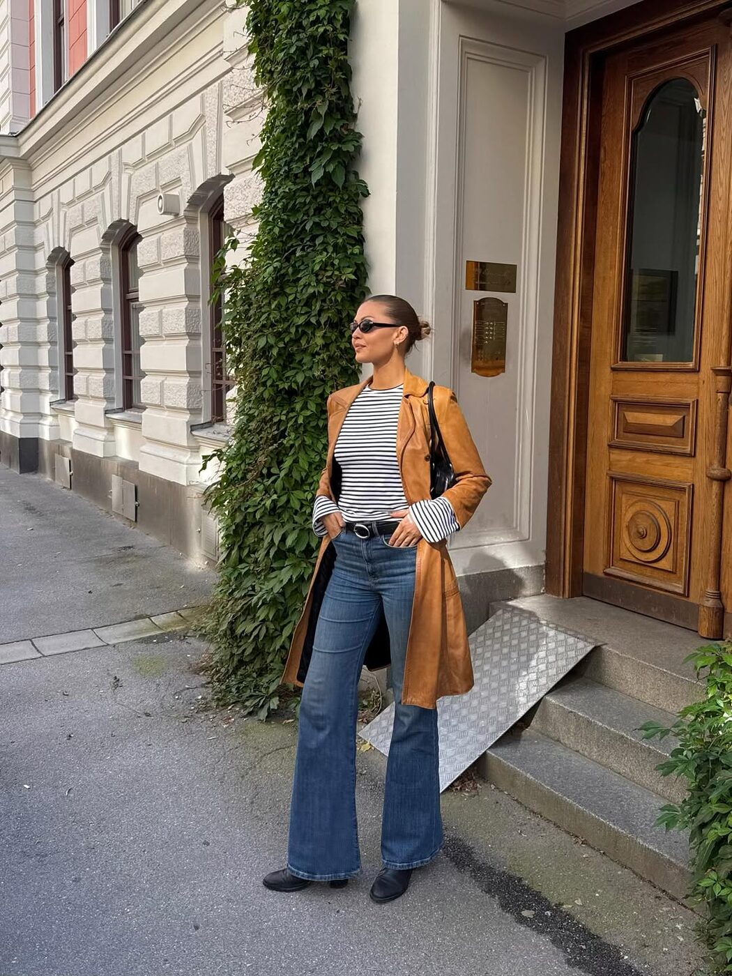 가장 클래식한 블랙 & 화이트 스트라이프 티셔츠 위에 카멜 컬러의 가죽 재킷을 매치해 빈티지한 무드로 연출했어요. 과하지 않은 패턴이 가죽 재킷의 무게감까지 중화해 주죠. 여기에 하이웨스트 플레어 진을 더해 전체적으로 길고 슬림한 실루엣을 완성했습니다.
