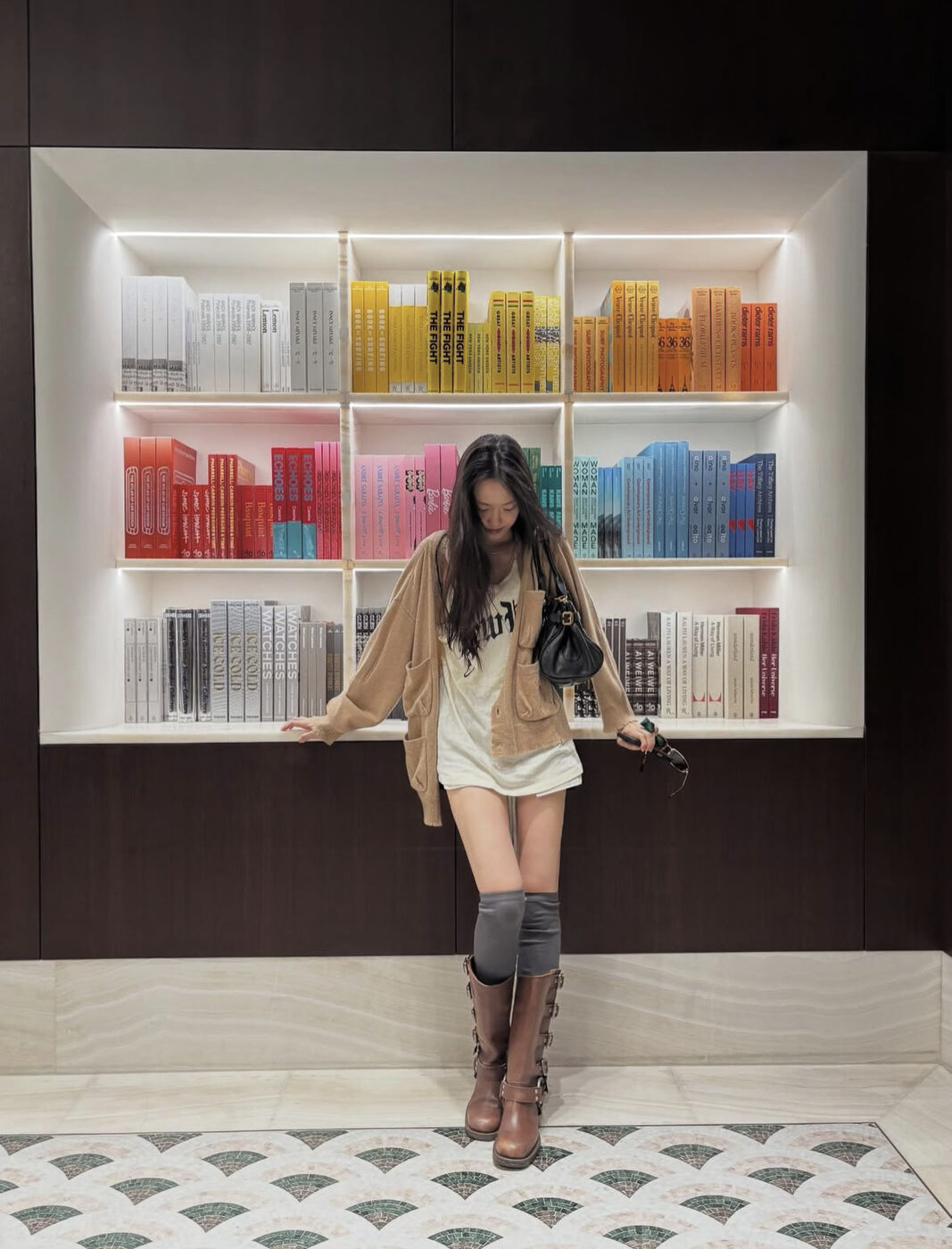 사복의 여왕, 손나은도 이 가을 무드의 스타트로 카디건을 골랐네요. 이 카디건 룩은 별 포인트가 없을수록 더 쿨합니다. 카디건을 오픈해서 입고 같은 기장의 티셔츠로 하의실종을 만들어 준 것인데요. 이때 포인트는 카디건에 신경쓰지 말고 일부러 늘어진 채로 루즈하게 두는 것! 반면에 신발에 힘을 주는 것이 좋습니다. 롱 부츠보다 기장이 긴 니 삭스로 한번더 엣지를 줘도 훌륭하겠죠.
