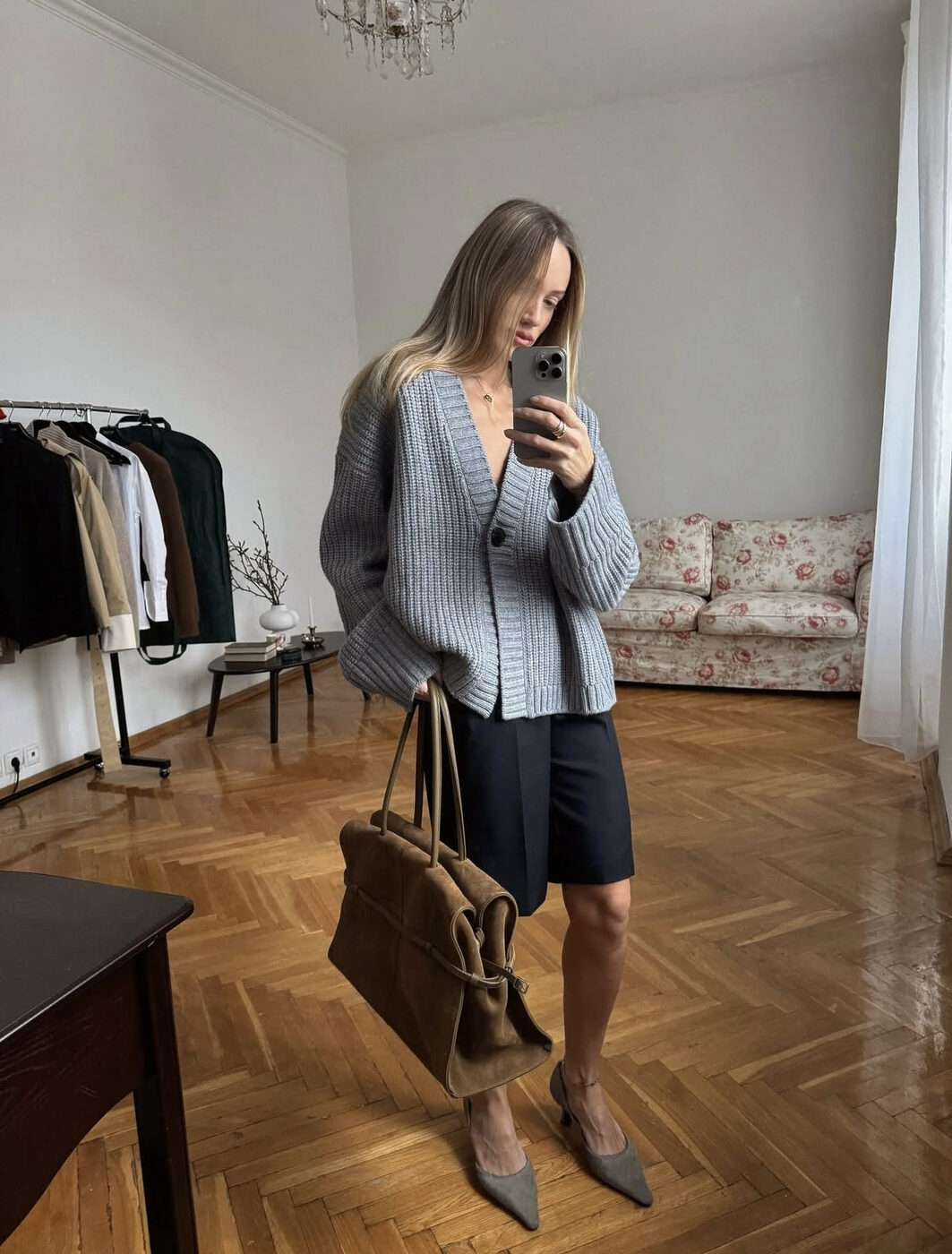 벌키한 소재의 카디건을 골랐다면, 최대한 다른 곳은 비우는 게 좋습니다. 두꺼운 카디건은 부해보일 수 있는데, 이너를 입지 않고 단독으로만 걸쳐주니 훨씬 세련돼보이죠. 하의는 울 소재의 반바지로 가볍게 마무리해주고요. 여기선 가방을 스웨이드 재질의 묵직한 빅백을 들어 무게감을 가져갔는데요. 그래서 출근 룩으로도 손색없고 어딜가나 우아하단 소리 이천번은 들을 수 있을 듯한 데일리 룩이 완성됐습니다.