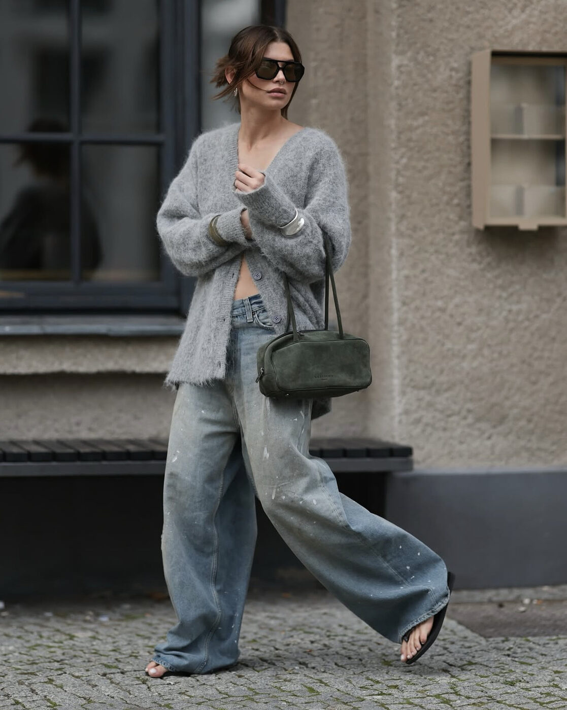 ‘난 그래도 긴 바지를 입고 싶다’하는 분들이라면, 도톰한 카디건의 단추 아래를 몇개 열어 살짝 여유를 주는 것을 추천해요. 단추를 열어서 살을 보여줄수록 답답하지 않고 옷차림이 덩어리지지않습니다. 위에 소개한 룩과는 달리 긴바지 긴 카디건의 조합이라면, 가방은 미니멀하게 작은 사이즈로 드는 것이 좋아요. 부피 있는 착장에 큰 가방까지 더해지면 전체적으로 과해보일 수 있으니까요.