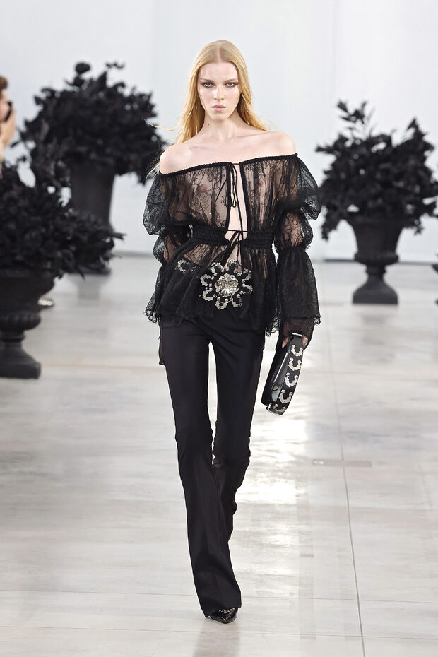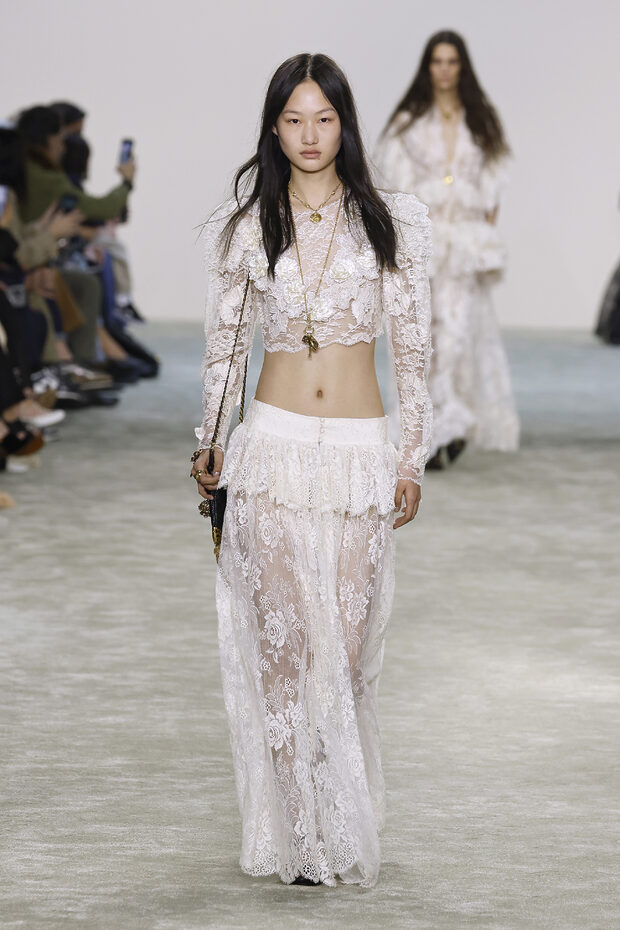 F/W 컬렉션부터 살펴볼까요? 블루마린은 오프숄더 블라우스와 러플 디테일이 더해진 블라우스를 시어한 소재로 선보이며 로맨틱한 무드를 이어갔습니다. 슬림한 데님 팬츠에 메탈릭한 빅 버클 벨트를 더해 보헤미안 무드를 완성했고요. 끌로에는 플라워 아플리케가 장식된 시스루 셋업 룩을 선보이며 몽환적인 분위기를 연출했습니다.