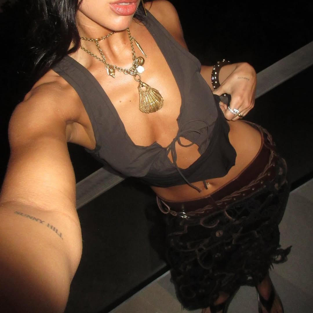 여름이 지나갈 즘에도 하얀 블라우스는 그녀의 보호 시크룩 공식에 시작점이 된 아이템이었습니다. 대신 시스루 형태의 톱을 선택하고 여기에 쇼츠, 그리고 검은 십자가 네크리스와 금장 벨트로 클래식한 보헤미안 룩을 선보였죠. 레이스 브라 톱과 러플이 달린 복서 쇼츠를 레이어드한 디테일도 숨길 수 없는데요. 덕분에 로맨틱한 보헤미안 감성에 은은한 관능미가 더해졌습니다.