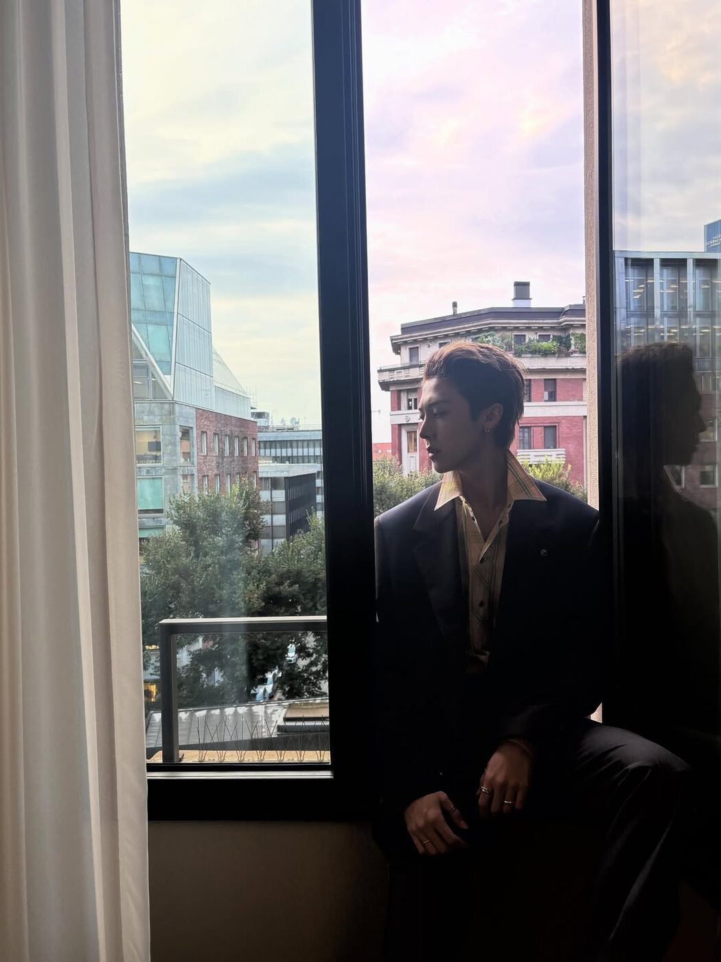 한편 우찬은 에지 넘치는 슈트를 선택했는데요. 스트라이프 패턴의 셔츠로 고루하지 않은 포인트를 더했습니다.