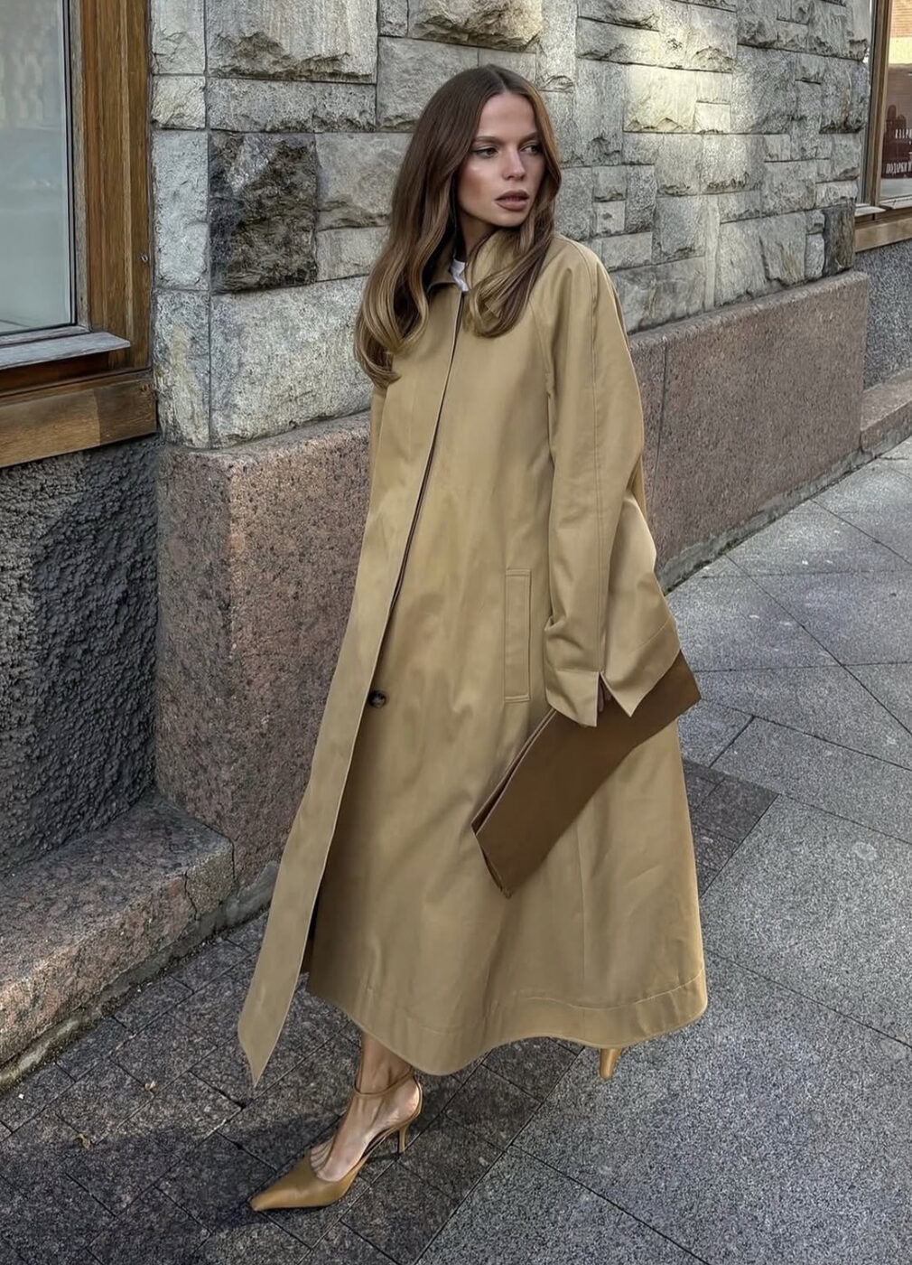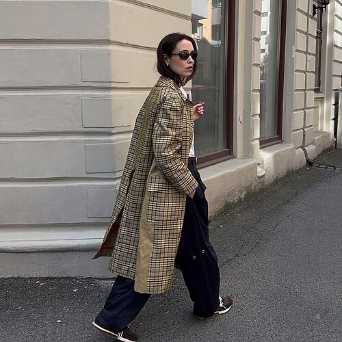 가을에 트렌치코트가 빠질 순 없죠. 이번 시즌엔 전형적인 벨트 스타일의 코트가 아닌 레이디 코트 형식의 맥시 실루엣에 도전해 보는 건 어떨까요? 이너웨어 또한 단정한 화이트 셔츠에 와이드 핏의 수트 팬츠의 맥시멀 스타일링에 눈길이 갑니다. 코트가 땅 끝에 닿을 정도로 길어야 더 멋져 보인다는 것을 기억하세요.