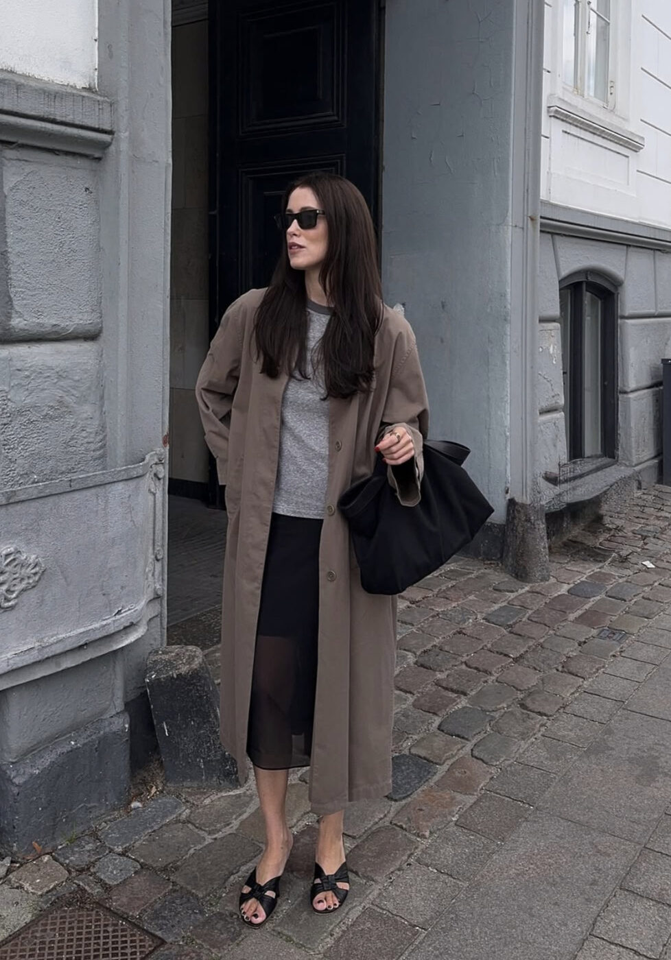 시스루 스커트를 가을까지 입고 싶다면, 이 롱 아우터와의 조합을 눈 여겨 보세요. 심플한 그레이 티셔츠에 은근히 비치는 블랙 스커트, 그리고 샌들 슈즈를 신고 그 위에 코튼 소재의 브라운 롱 코트로 가을의 멋을 더했습니다.