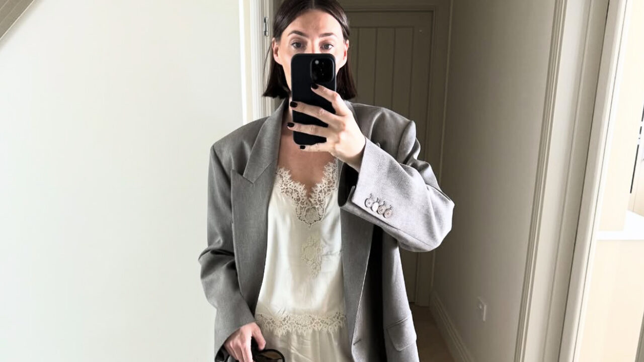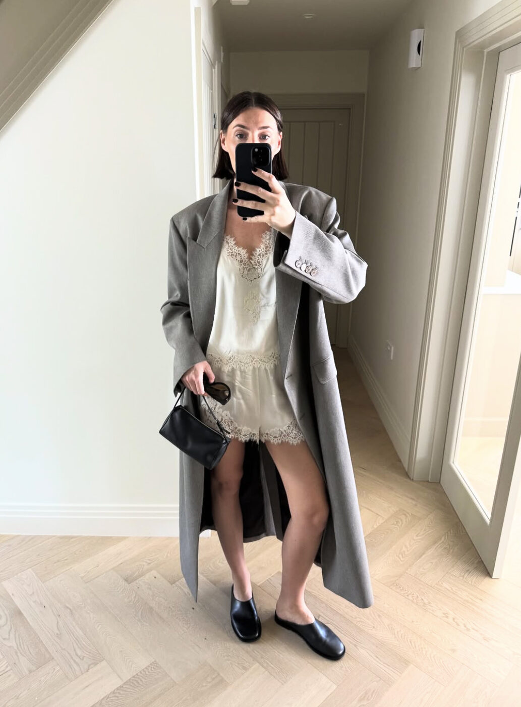 꾸준히 사랑받고 있는 레이스 장식의 란제리 룩에 파워 숄더가 돋보이는 회색 코트를 매칭해 반전 매력을 드러냈어요. 마치 잠옷을 입고 그 위에 아빠 코트를 걸친 듯, 페미닌함과 오버사이즈의 매니시함이 어우러진 매력적인 룩엔 역시나 블랙 슈즈와 백이 시크한 마무리를 맡았습니다.