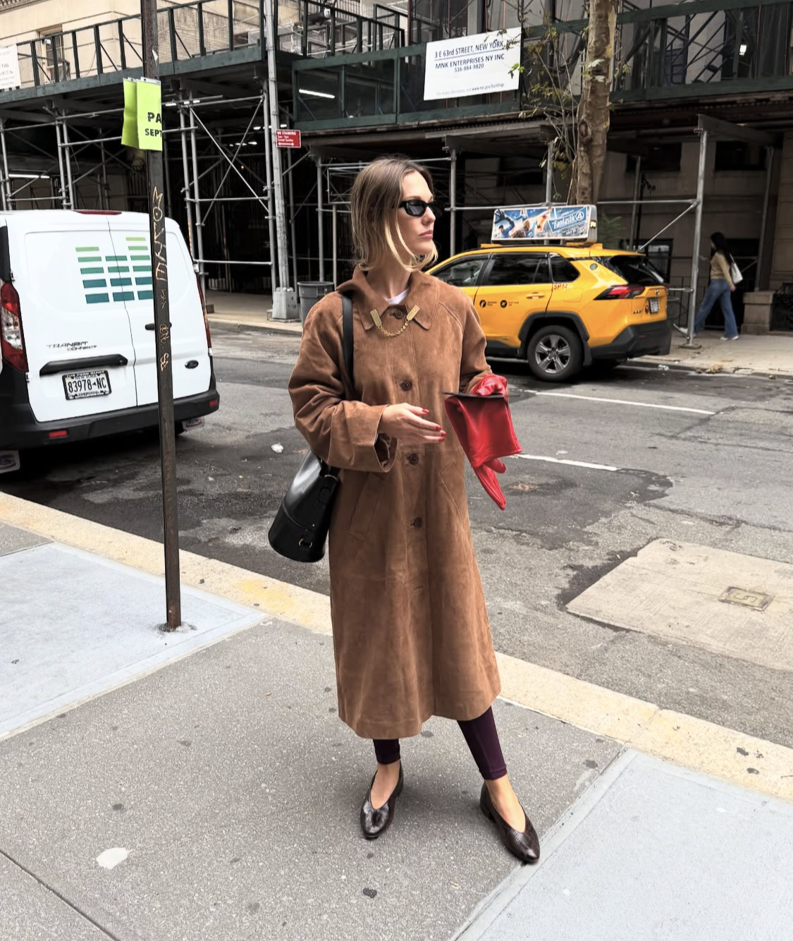 여전히 가을 아우터의 대세를 이루는 브라운 스웨이드 코트를 잊지 마시길. 재킷보다 더 우아하고 센치한 분위기를 연출하는 갈색의 스웨이드 코트에는 블랙 슈즈와 버킷 백으로 감각적인 액세서리 매칭을 선보였습니다.