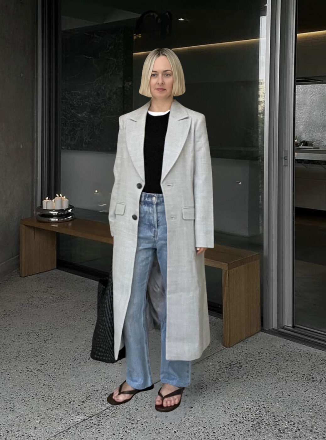 물 빠진 일자 청바지에 검은색 톱, 그리고 블랙 플립플롭을 신어 여름과 다를 바 없는 캐주얼한 스타일링에 테일러드 핏의 포멀한 그레이 롱 코트를 걸쳤어요. 가벼운 소재로 무겁지 않은 분위기를 살린 밝은 회색 톤의 롱 코트 하나가 시크한 간절기 패션을 완성해 줍니다.