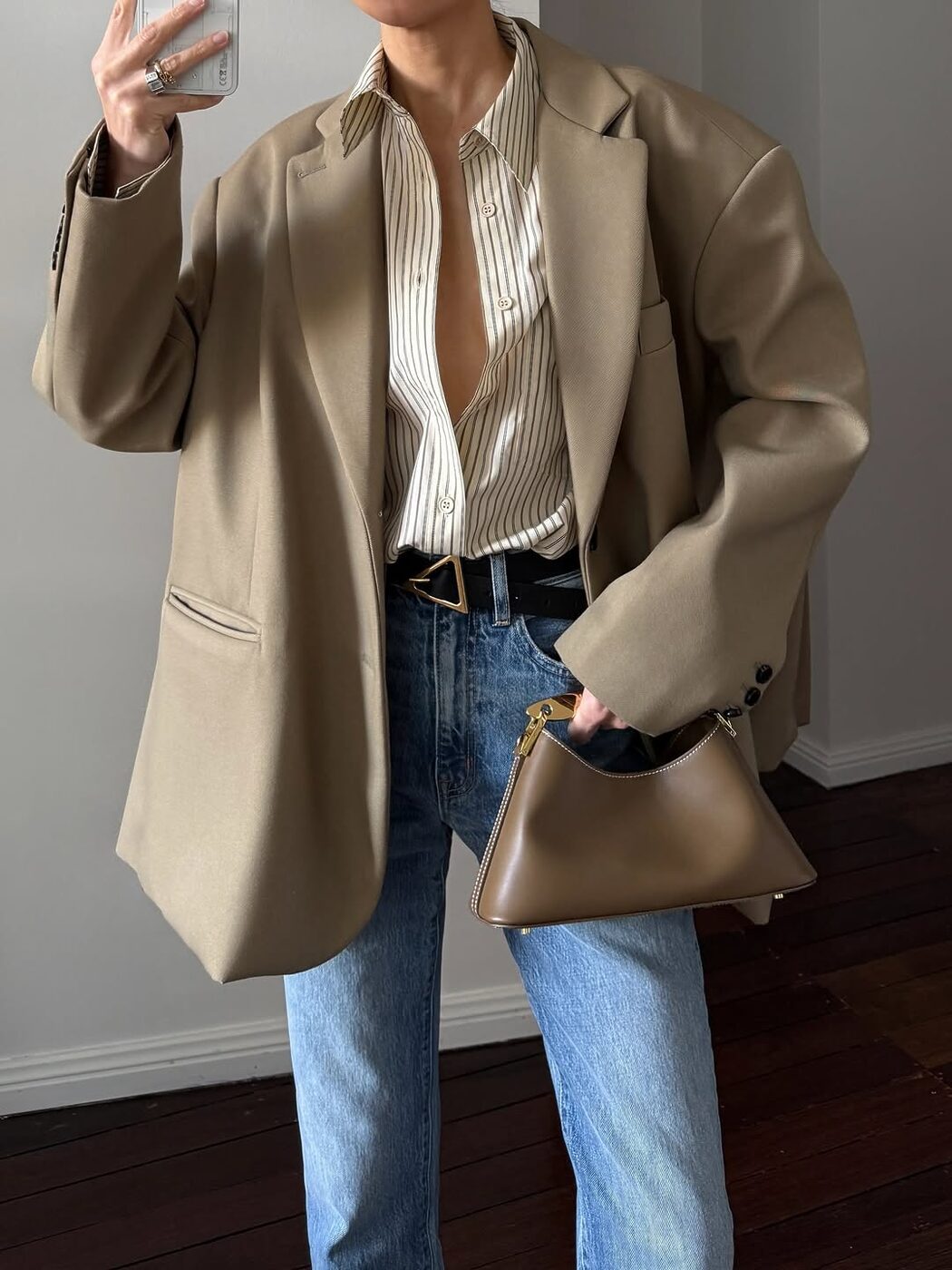 베이지나 옅은 카멜색 재킷을 선택하는 것 역시 부드러운 인상을 주기에 좋은 선택. 이때 이너는 너무 어둡지 않은 색으로, 재킷과 비슷한 아이보리 톤이나 화이트 컬러를 고르는 것이 좋습니다.