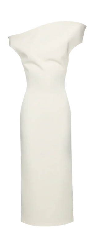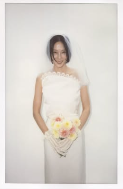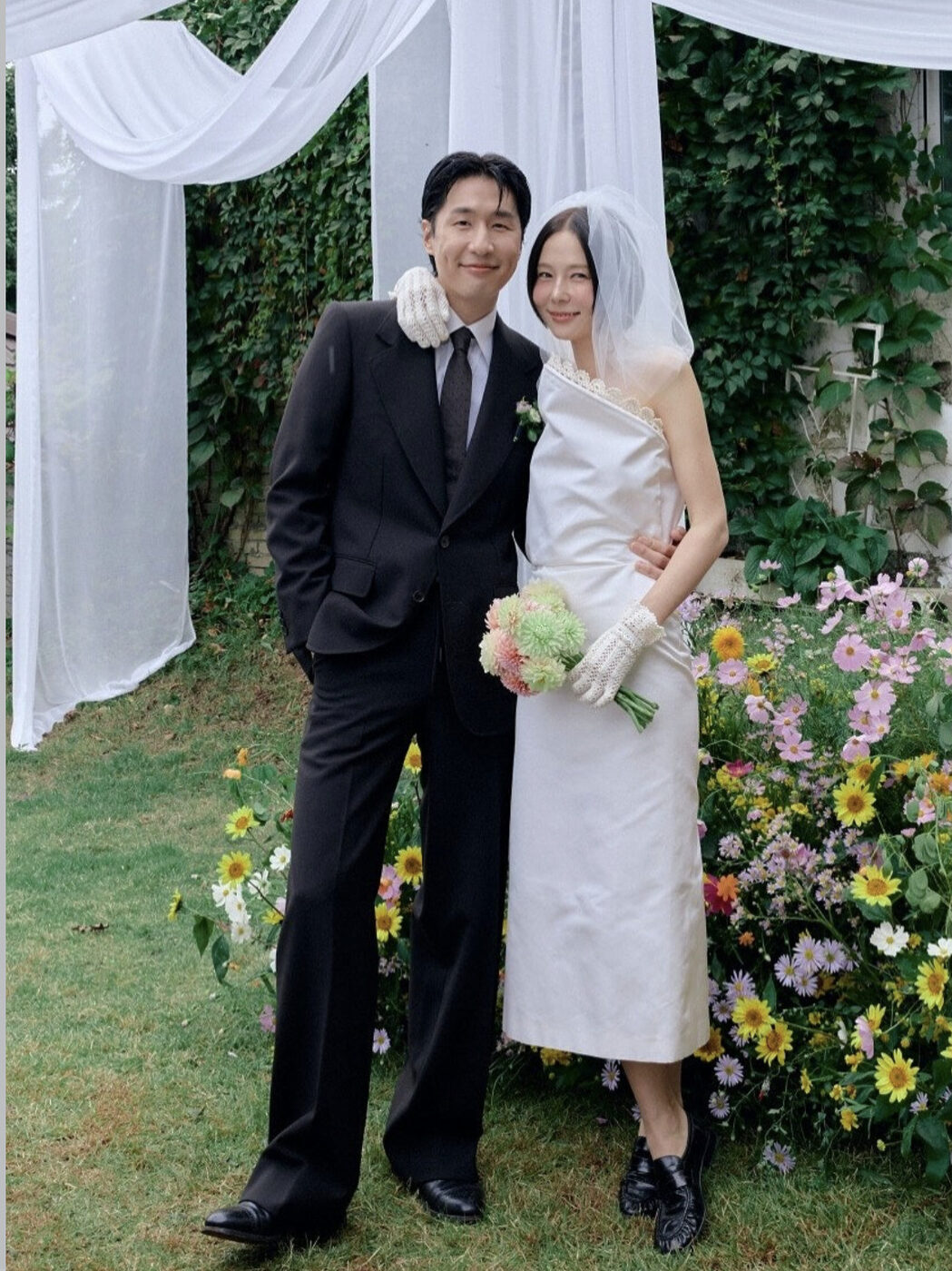 김나영은 마치 꽃 다발을 연상케 하는 가슴 앞으로 삐죽 솟아 난 디자인의 화이트 오프 숄더 미디 드레스를 골랐어요. 자잘한 레이스 트리밍을 제외하곤 미니멀한 실루엣이 돋보이는 드레스이는 그보다 더 시크한 액세서리 매칭을 선보였습니다. 블랙 로퍼로 트렌디한 브라이덜 룩을 완성했죠. 숏 베일과 글러브 또한 과하지 않은, 모던하고 세련된 분위기를 선사했어요.