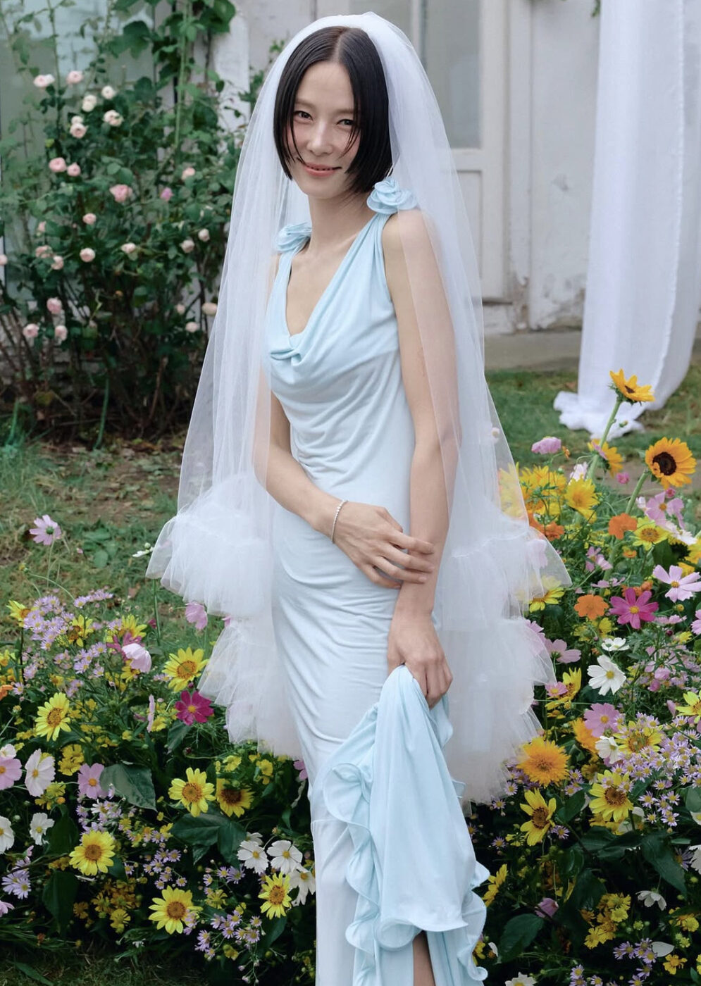 두번째 룩은 어깨의 코르사주 장식이 돋보이는 하늘색 실크 드레이핑 드레스였습니다. 자연스러운 주름 장식이 여성스러운 슬림 드레스는 뒤로 길게 늘어진 트레인 디테일이 예식에 걸맞은 스타일을 연출했어요. 여기엔 러플이 달린 풍성한 화이트 베일을 써 로맨틱함을 강조했죠.