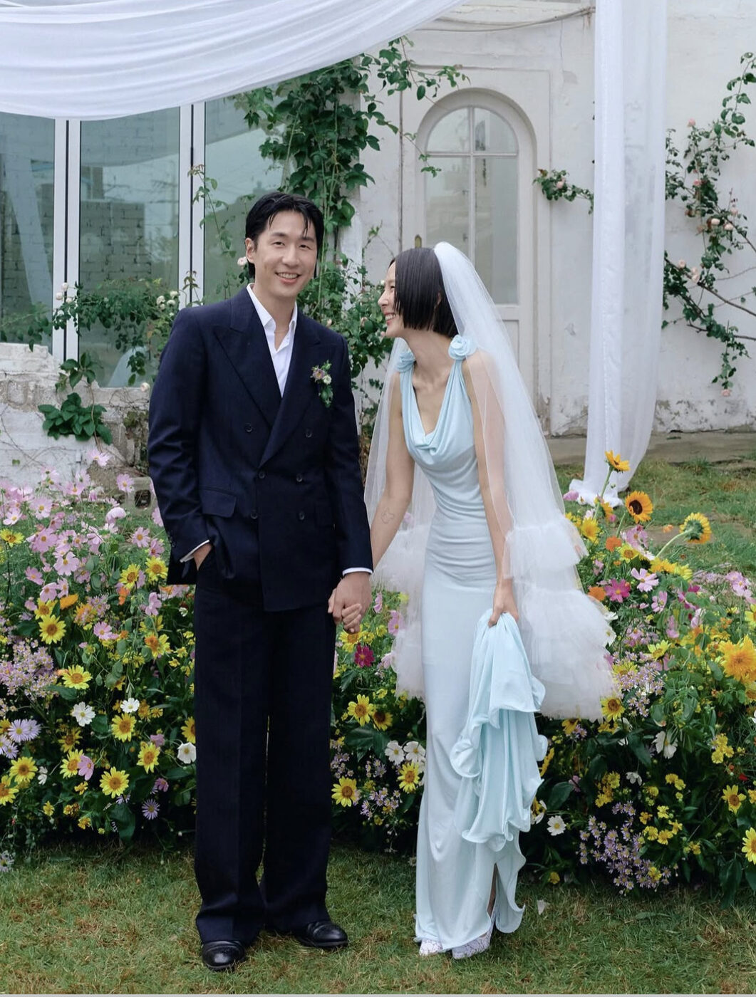 마이큐는 타이를 하지 않은 화이트 셔츠에 네이비 컬러의 더블 브레스트 수트를 입고 하늘색의 롱 드레스를 입은 김나영과 감각적인 웨딩 패션을 이루었습니다.