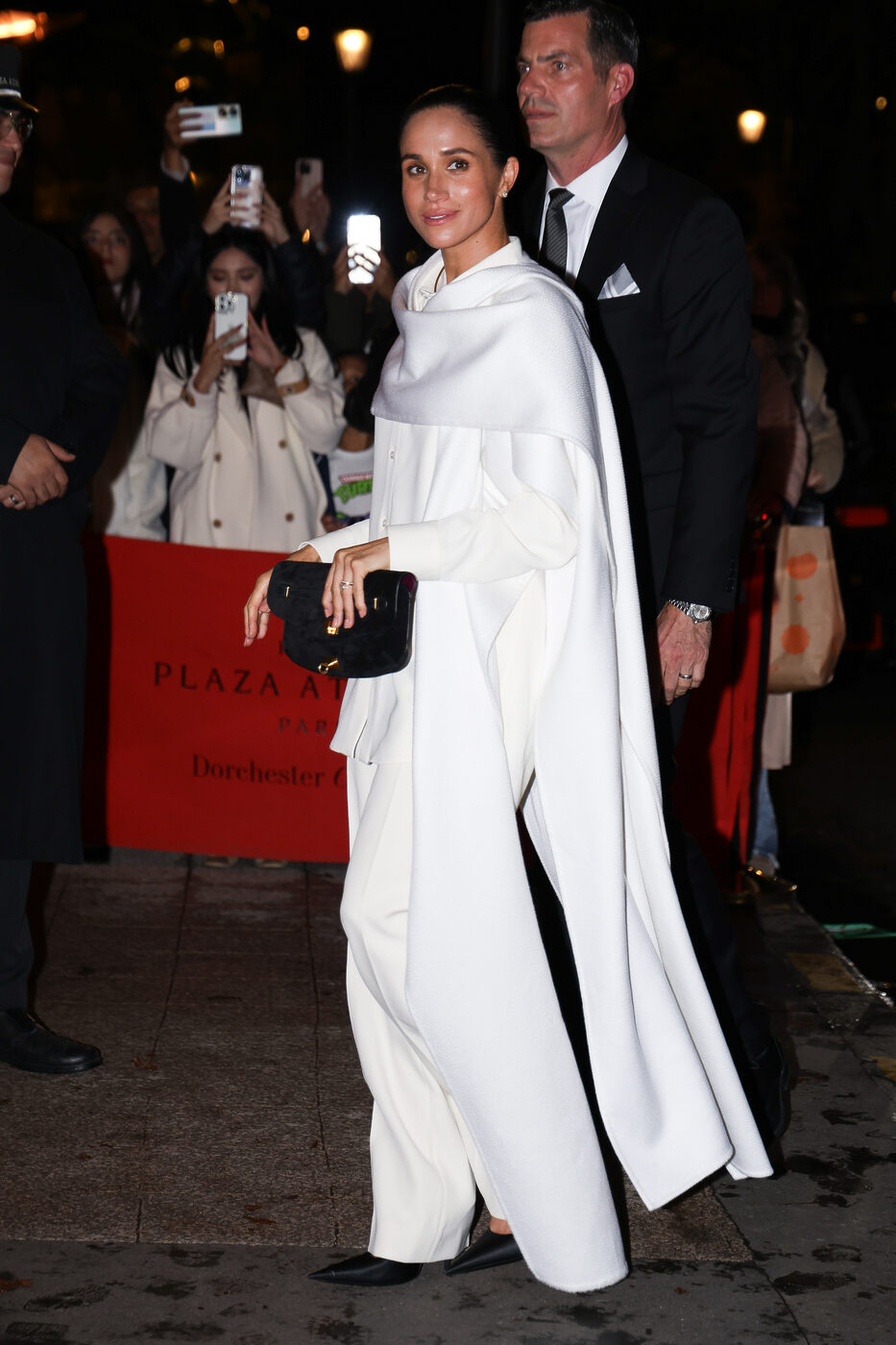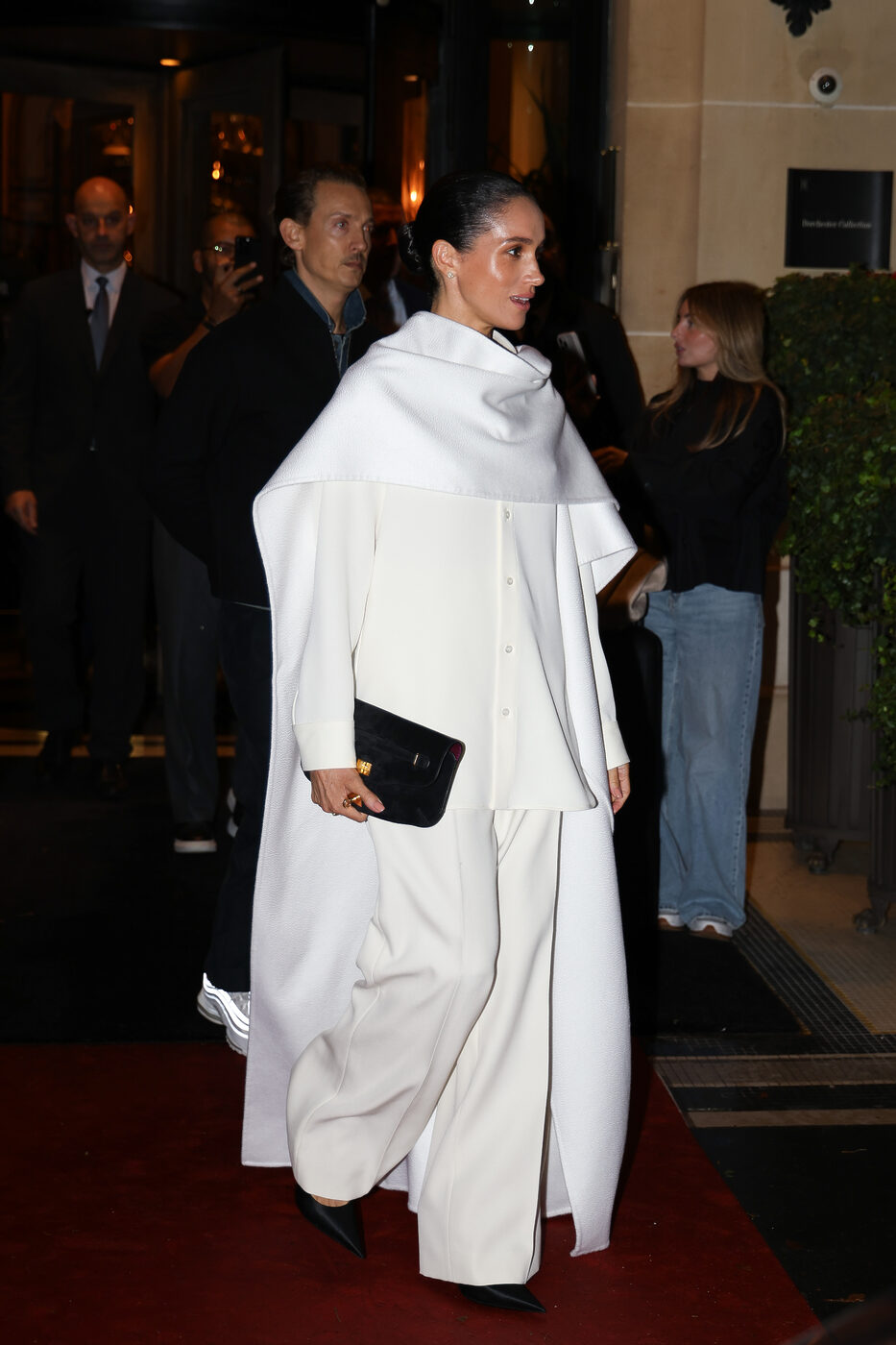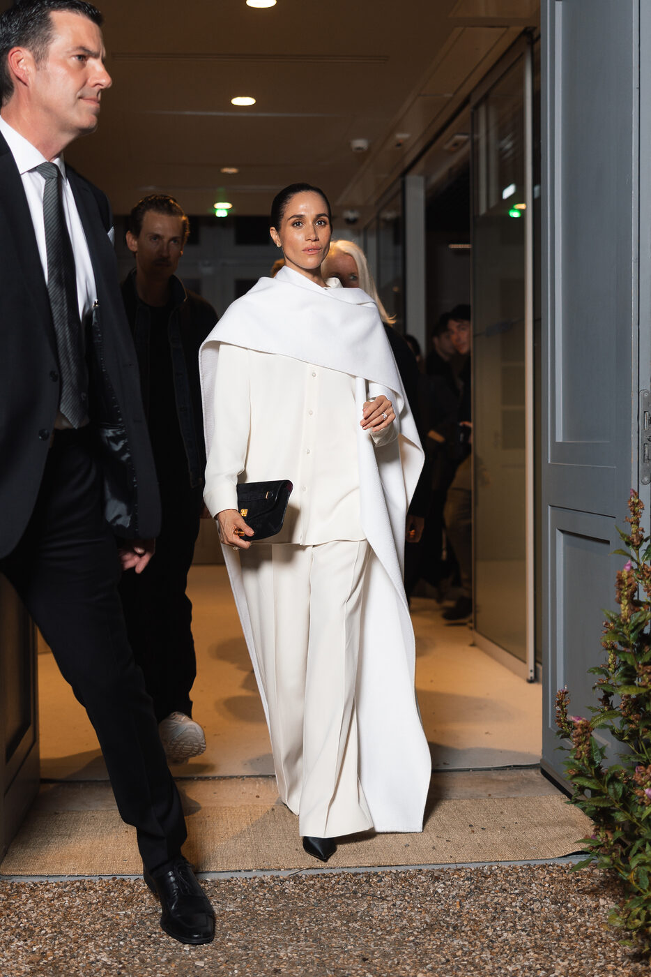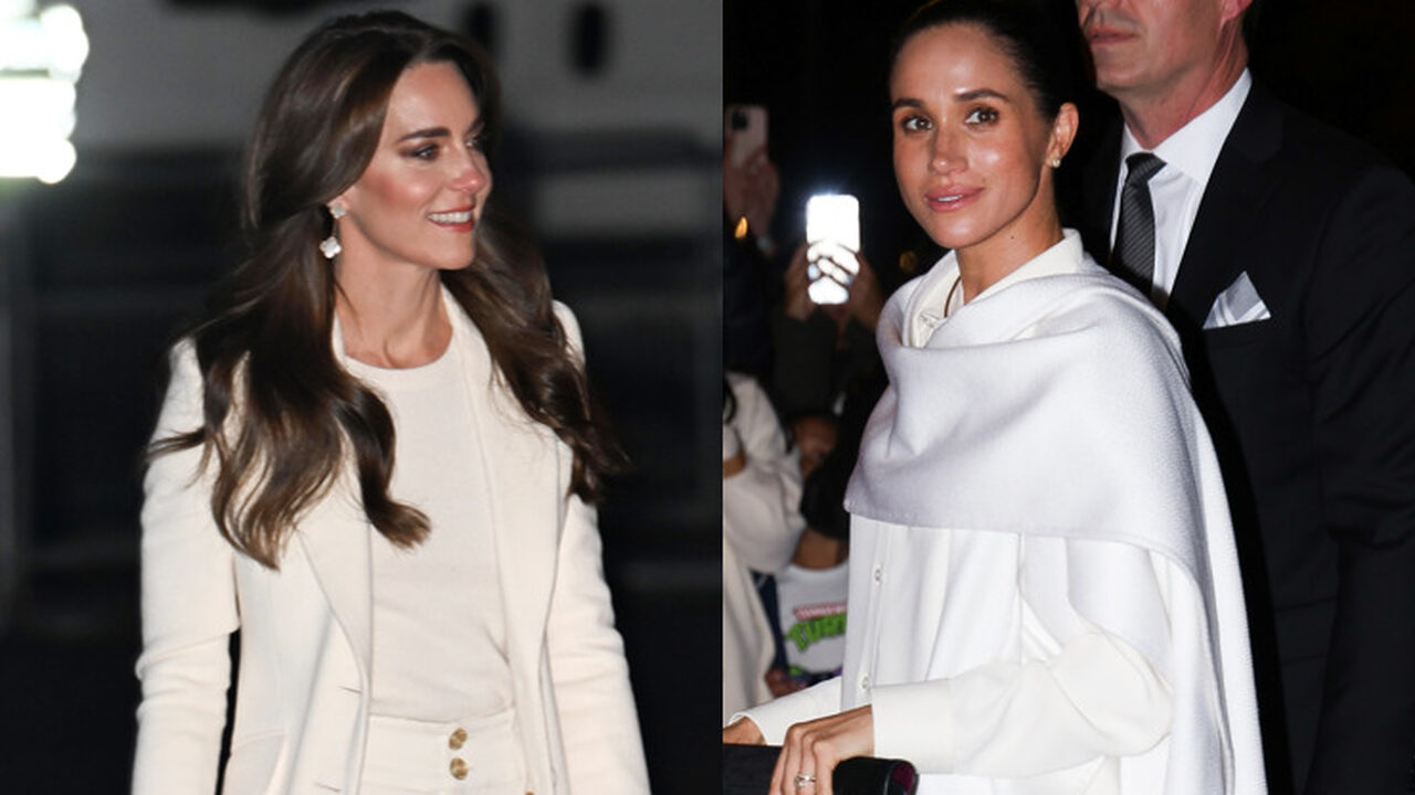 블랙 펌프스 힐과 심플한 블랙 클러치 백으로 더욱 선명한 블랙 앤 화이트의 모던함을 강조했습니다. 그리고 메건의 이 화이트 룩은, 지난 크리스마스 시즌 케이트 왕세자비가 입었던 화이트 슈트 룩을 떠올리게 했어요.