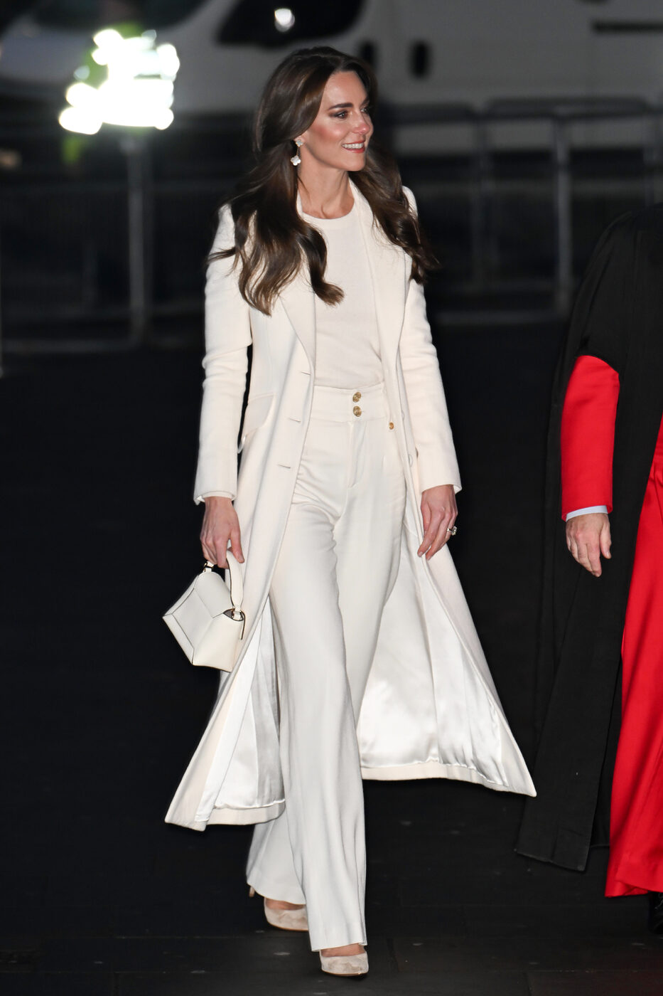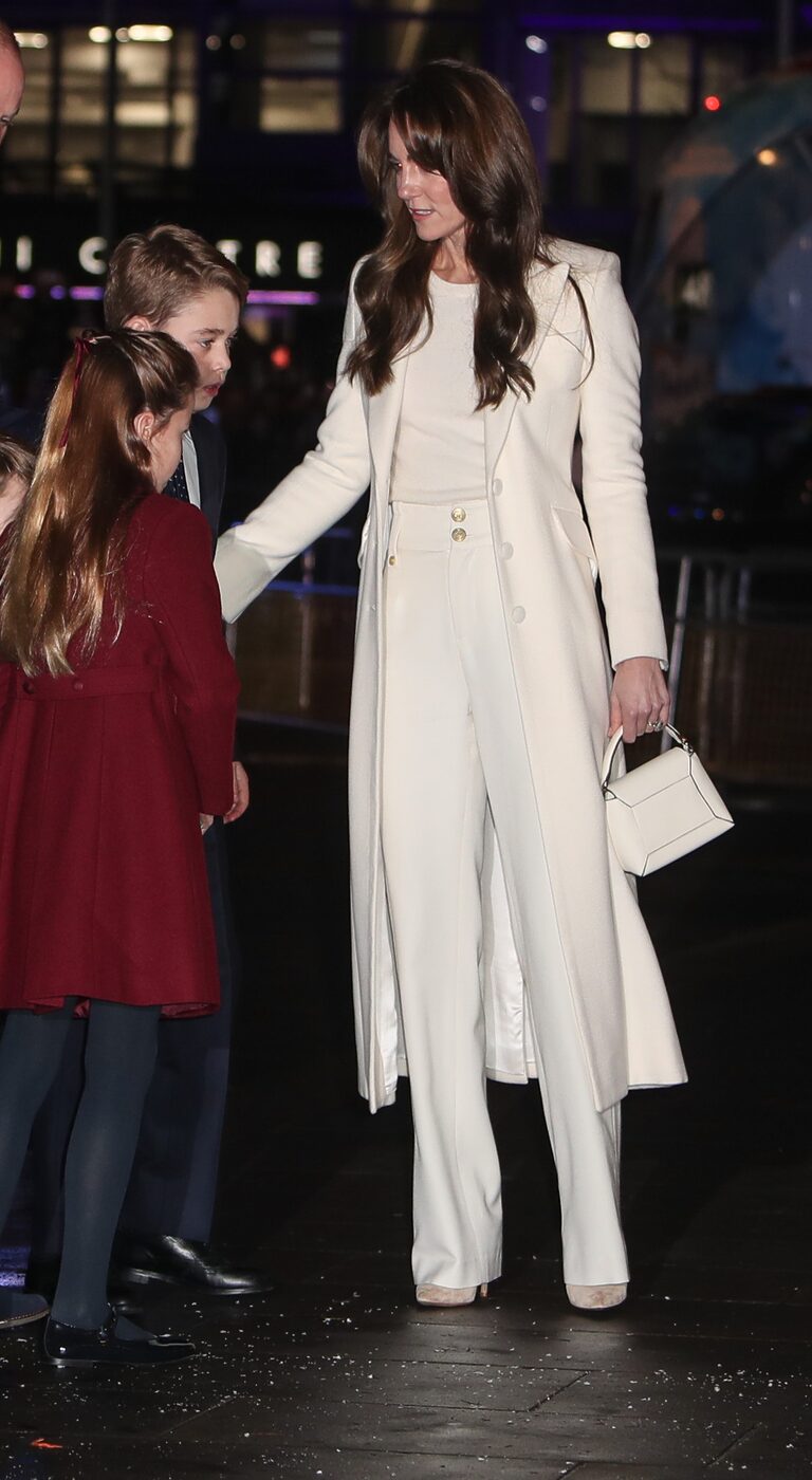 팬츠 또한 자신의 몸에 알맞은 슬림한 플레어 팬츠로 기본에 충실한 디자인을 골랐습니다. 여기에 심플한 화이트 톱과 우아한 롱 코트의 조합은 왕실의 기품을 표현하기에 부족함이 없었죠. 올 화이트 룩의 정점을 찍은 건 사각형의 스몰 토트 백이었어요. 전체가 화이트로 빛났던, 케이트 왕세자비의 찐 로열 패션이 돋보였습니다.