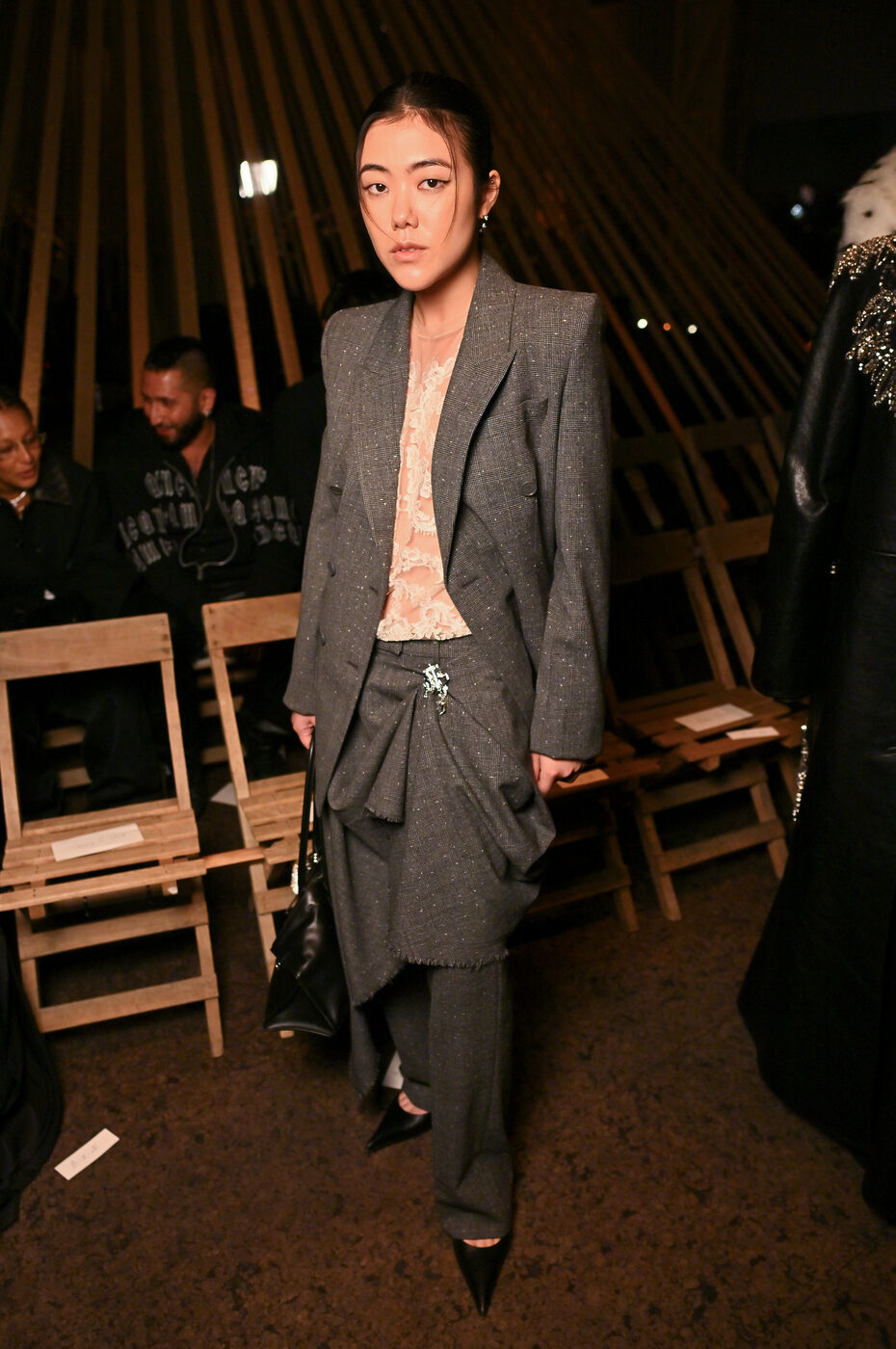 소재의 조합은 날카로움과 부드러움이 공존한다. 울 모헤어 홉색(hopsack), 프린트 가죽, 체인 메일, 금사 자수에 워시드 코튼 트윌과 선버스트 실크 하보타이를 더했다. 무겁지 않으면서도 풍부한 질감을 유지해 여름 시즌에도 입체적인 실루엣을 완성한다.