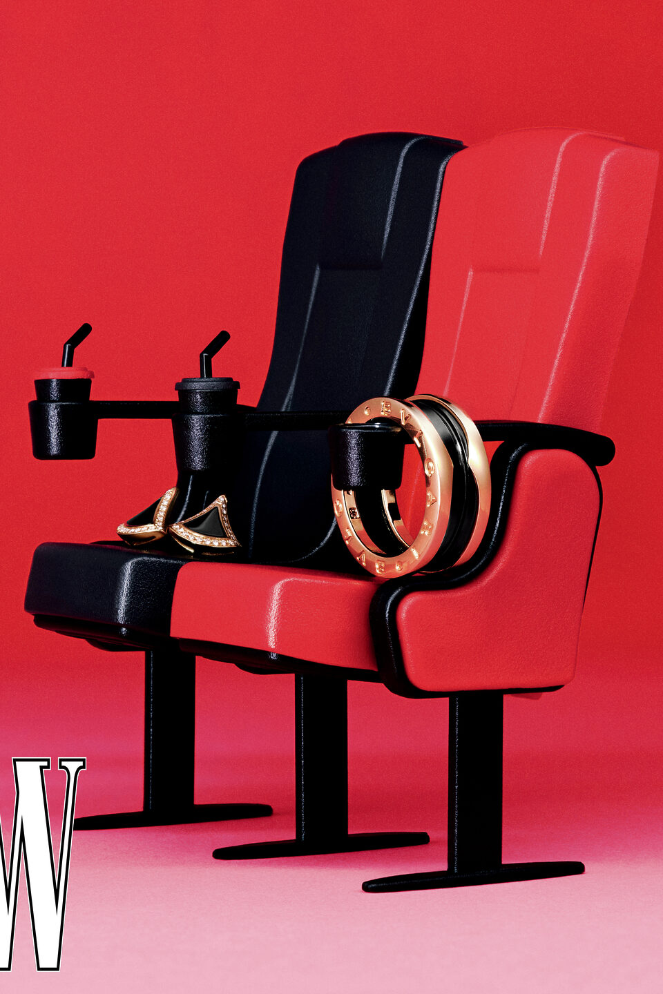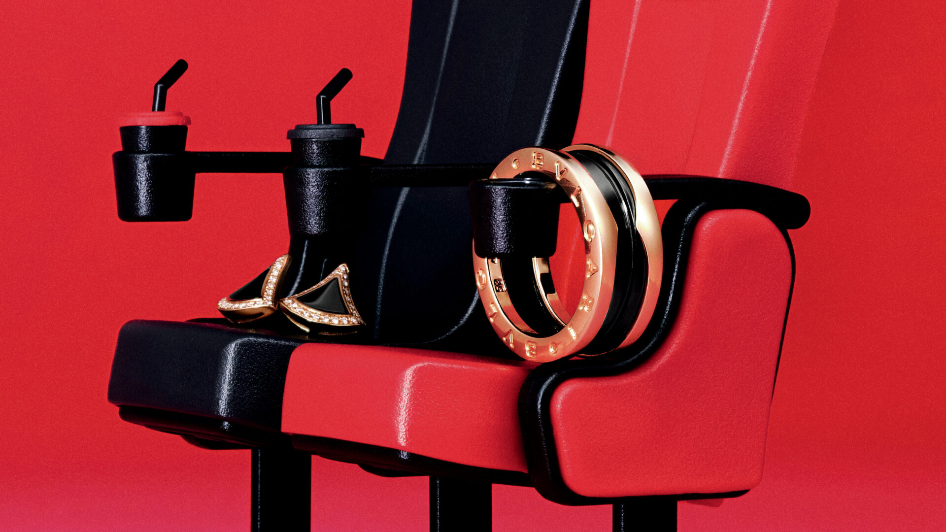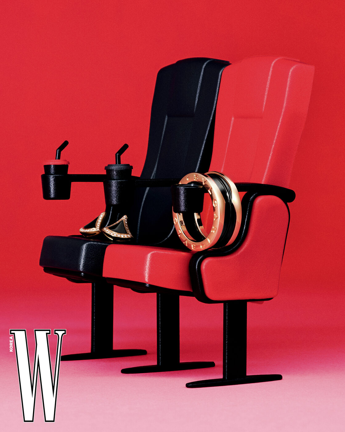 옐로 골드에 블랙 오닉스와 다이아몬드를 세팅한 디바스 드림 이어링과 로즈 골드에 블랙 세라믹을 세팅한 비제로원 2밴드 링은 Bvlgari 제품.