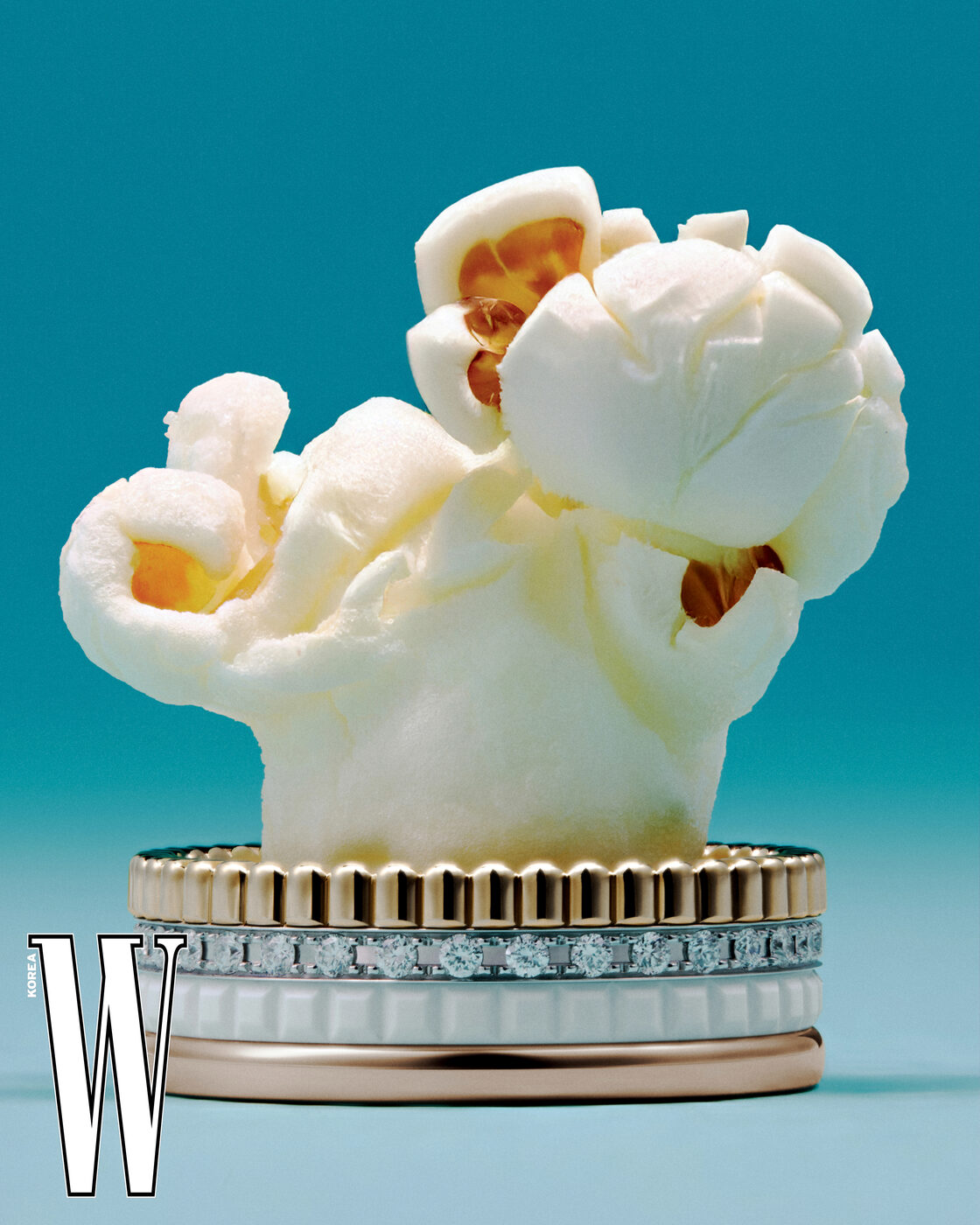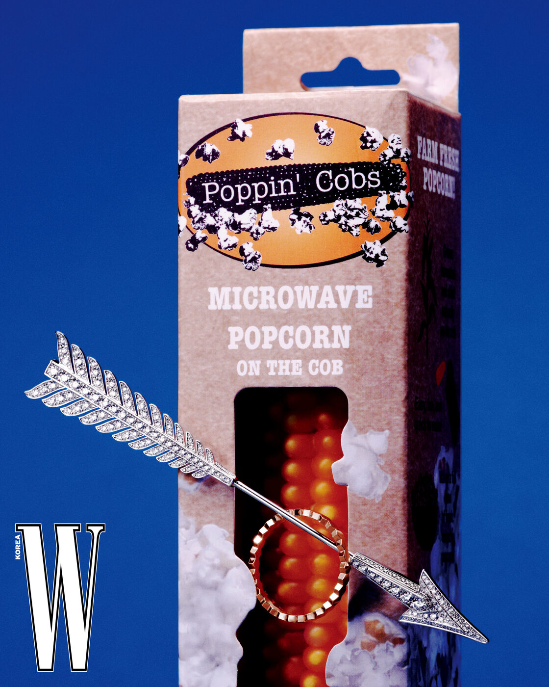 화이트 골드에 화이트 다이아몬드를 세팅한 플레쉬 다이아몬드 브로치는 Boucheron, 옐로 골드 소재의 비 드 쇼메 링은 Chaumet 제품.
