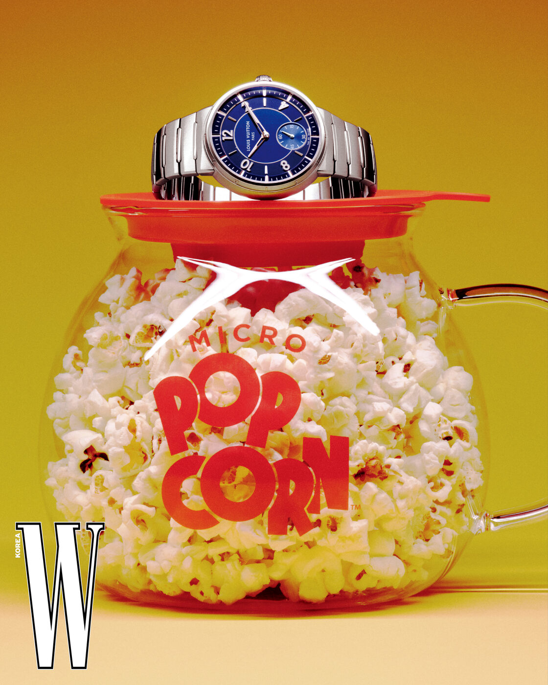 스틸 소재 케이스, 지름 40mm 사이즈의 블루 다이얼, 오토매틱 칼리버 LFT023을 탑재한 땅부르 40mm 블루 스틸 워치는 Louis Vuitton 제품.