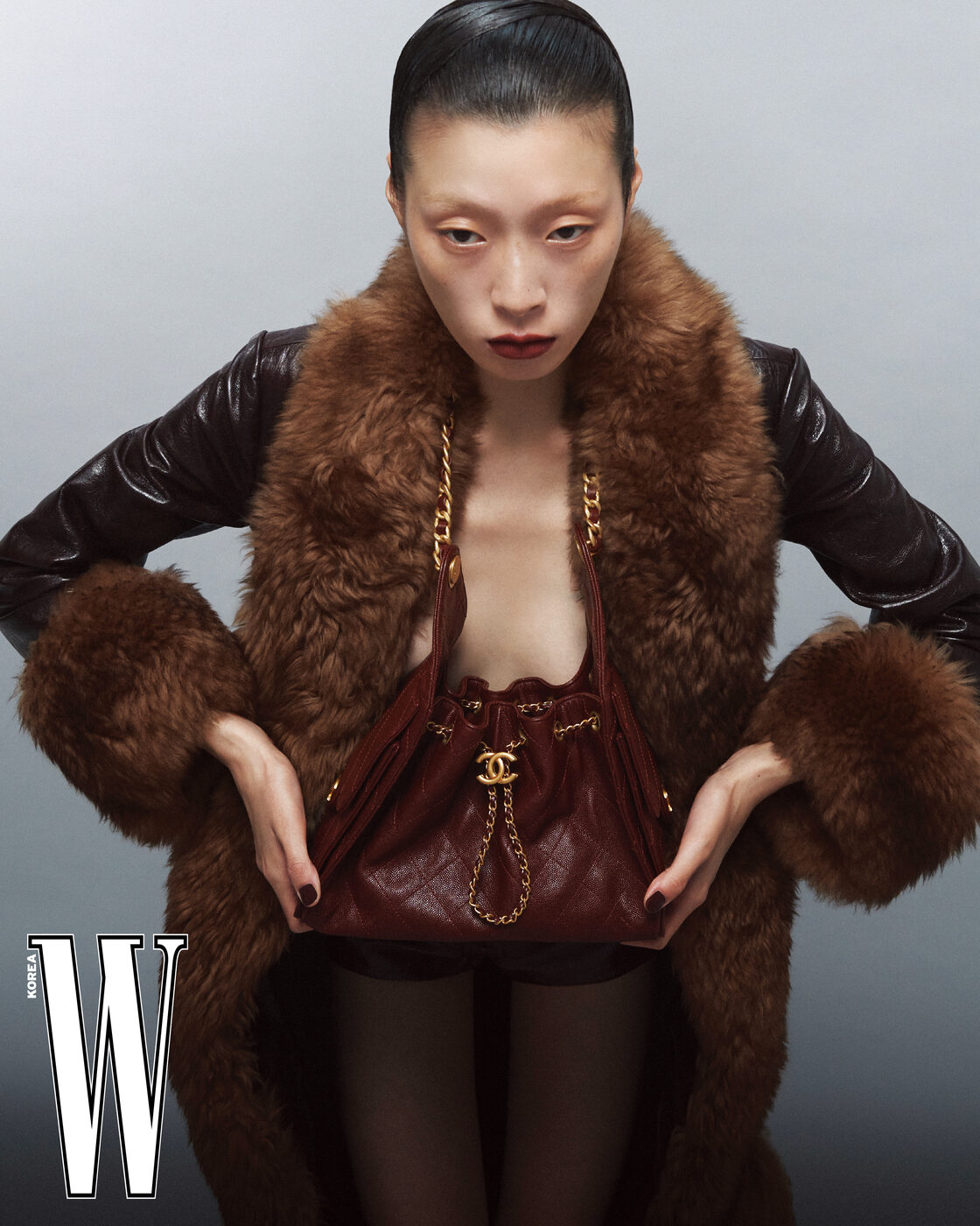 퍼 장식 코트는 끌로에, 샤넬 25 미디엄 백은 샤넬 제품.