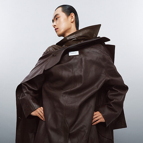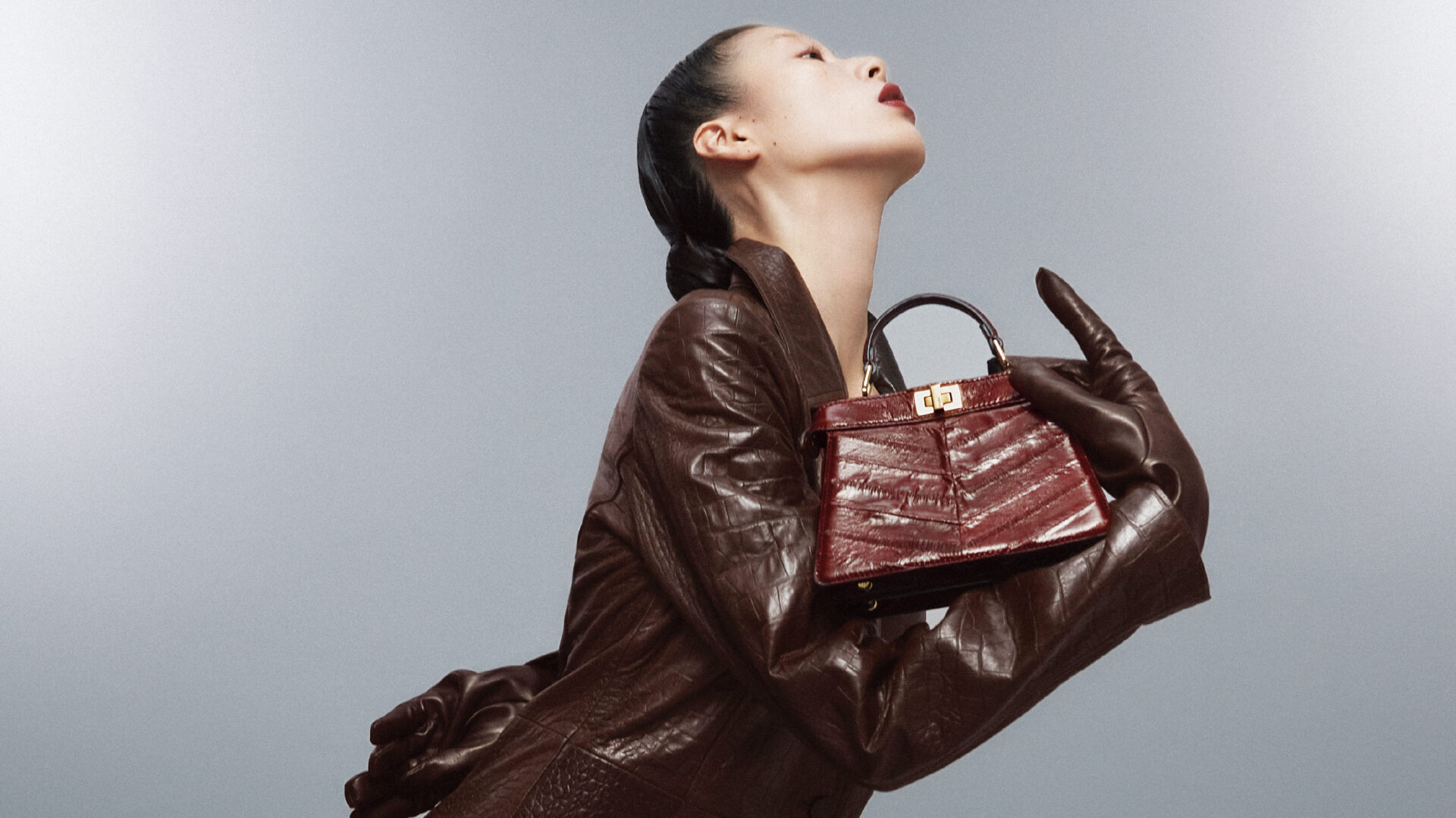 가죽 트렌치코트는 아미리, 가죽 장갑은 페라가모, 피카부 백은 펜디 제품.