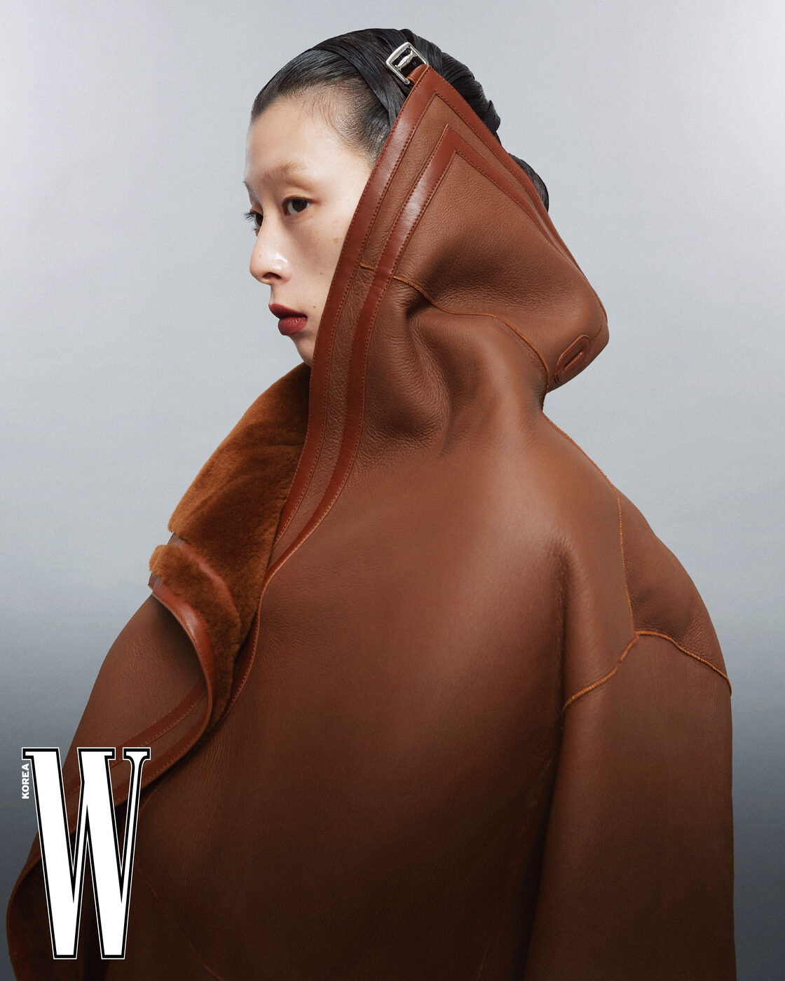 자연스러운 주름이 멋진 가죽 재킷, 벨트는 생 로랑 by 안토니 바카렐로, 스커트는 포츠 인터내셔널 제품.