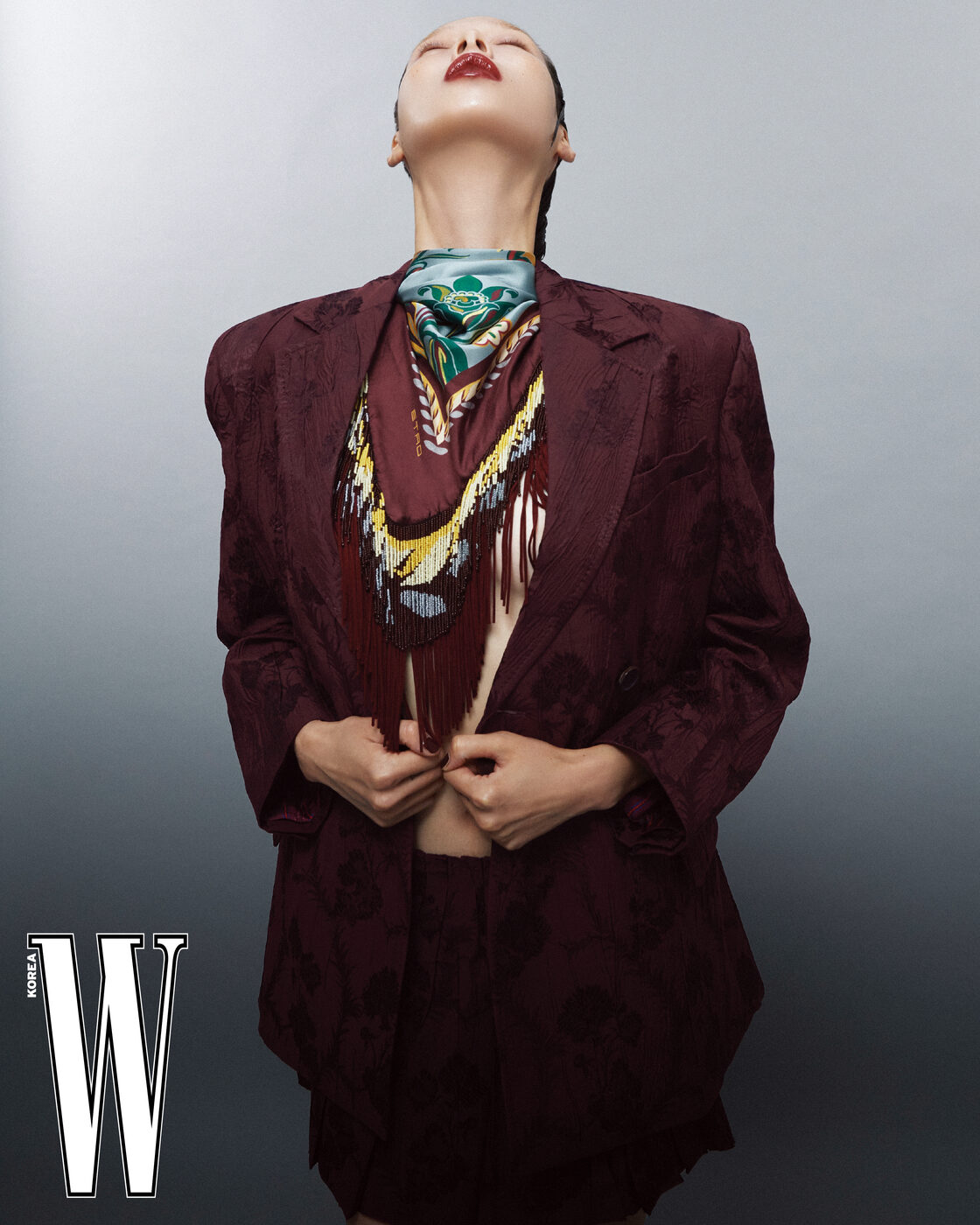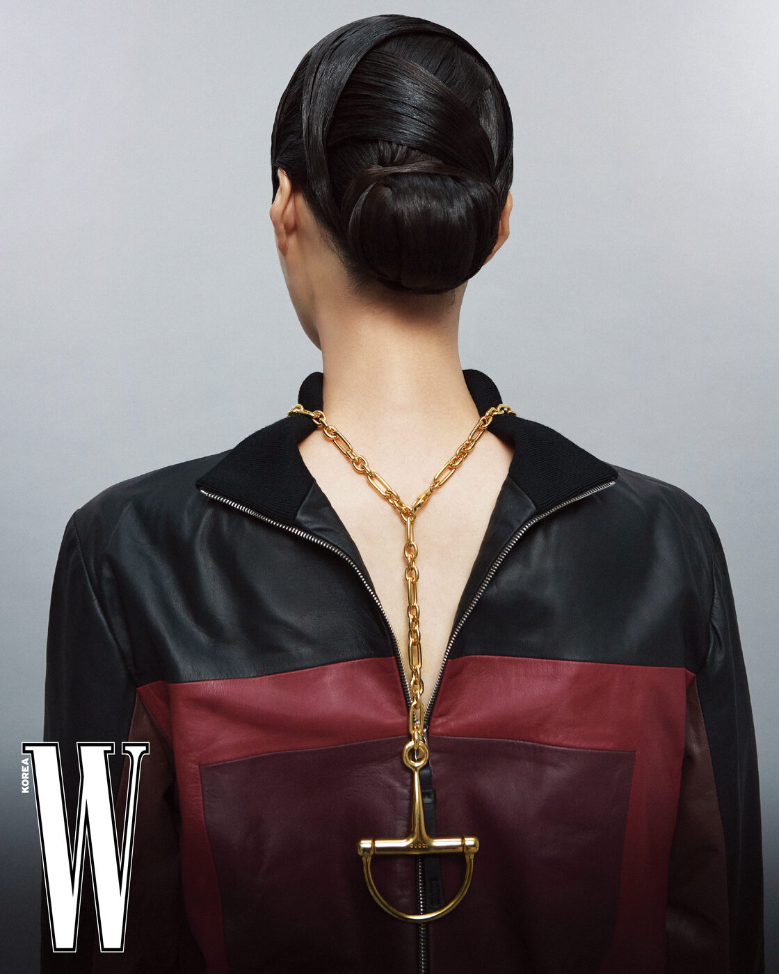 패치워크 가죽 재킷은 로에베, 커다란 홀스빗 네크리스는 구찌 제품.