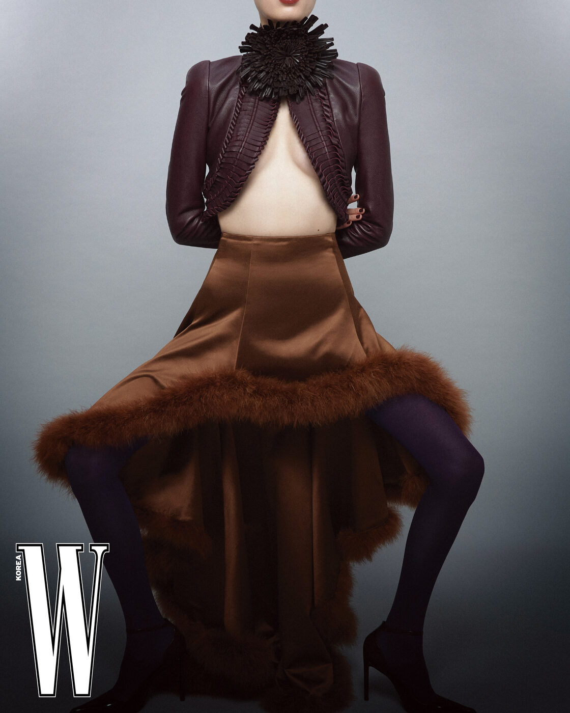 가죽 코르사주 장식 재킷은 알라이아, 퍼 장식 스커트는 뮈글러, 힐은 아미리 제품.
