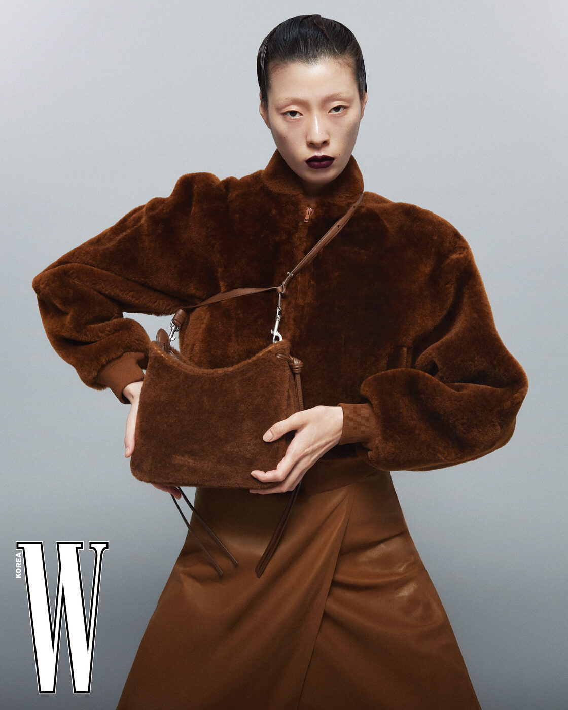 퍼 집업 재킷, 크로스백은 피비 파일로, 스커트는 랄프 로렌 제품.