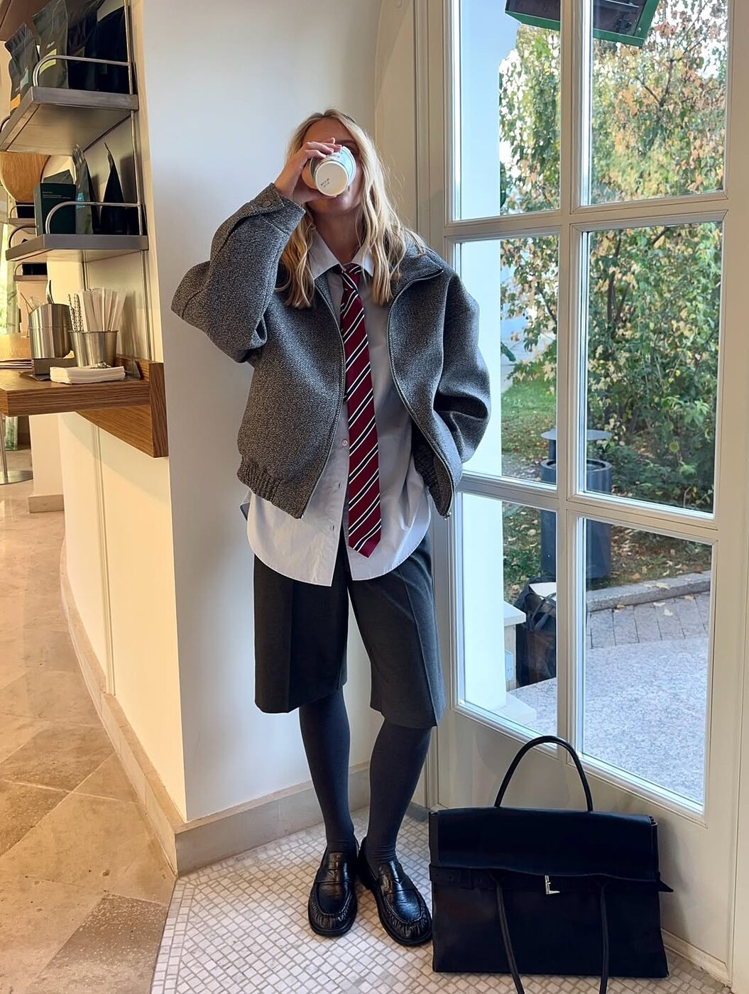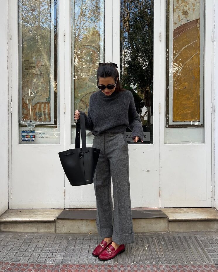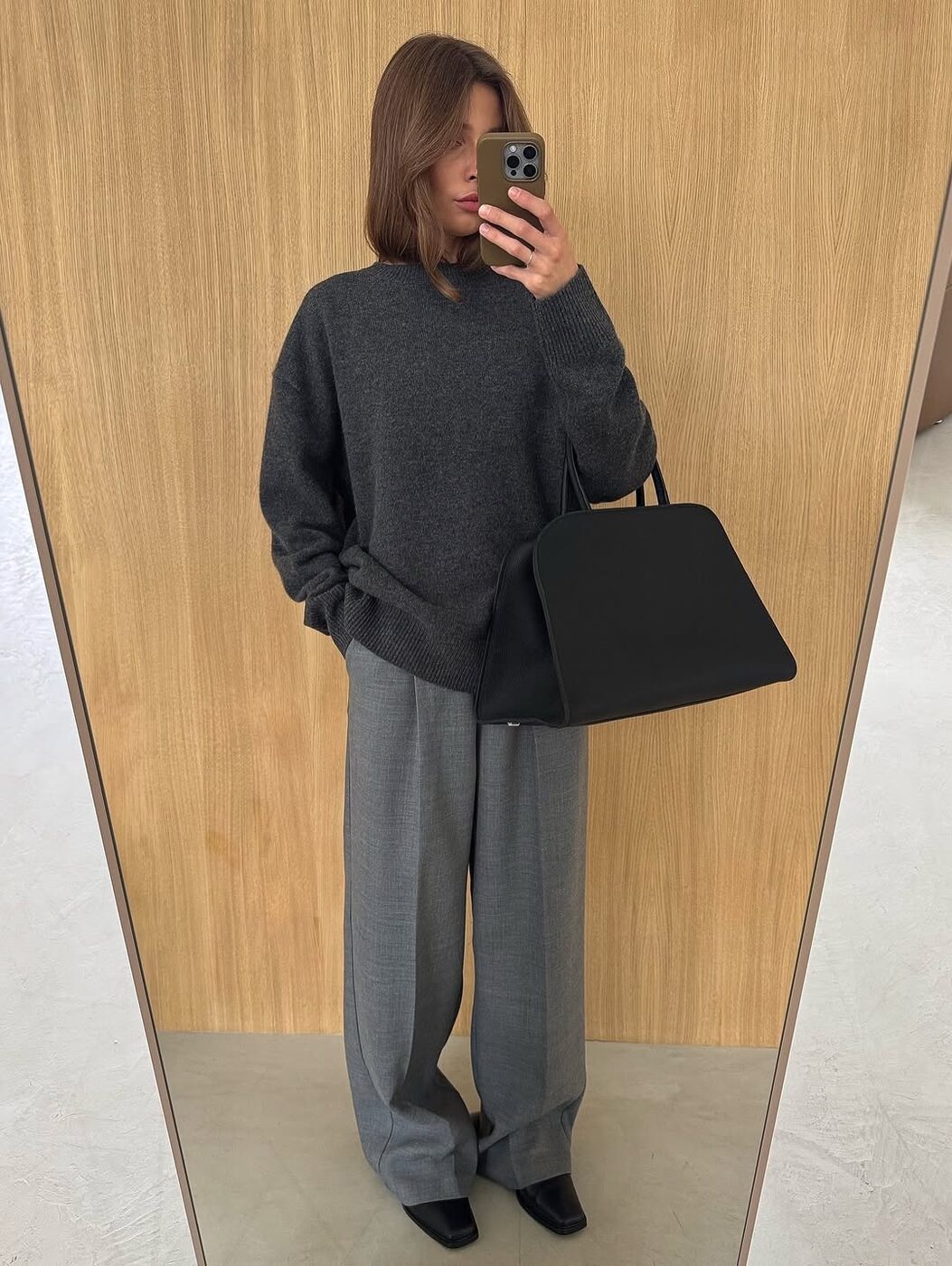 그레이 니트에 슬랙스를 매치해보세요. 무난하다고 느껴질 수 있지만, 사실 이 조합만큼 세련된 공식도 드물죠. 라이트 그레이 니트에 차콜 슬랙스를 매치하듯 상하의 컬러 밝기를 살짝 다르게하면 단조로웠던 룩에 레이어드한 것 같은 효과를 줄 수 있어요. 여기에 화이트 스니커즈와 미니멀한 토트백으로 시크하게 마무리하면 이번 시즌 핫한 ‘undone chic’이 완성할 수 있어요. 무심하게 툭 걸친, 그런 멋스러운 룩 말이죠.