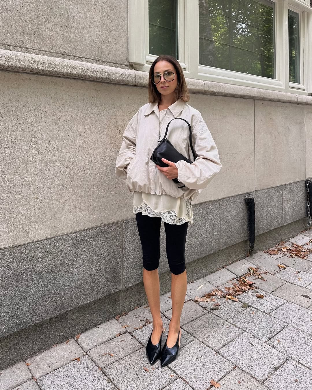 카프리 레깅스로 바람막이의 활동성을 높인 룩! 여기에 레이스 장식의 슬립 톱을 더하고 앞코가 뾰족한 슬링백 힐을 더하니 운동복이 단번에 스타일리시한 룩을 탈바꿈됩니다.