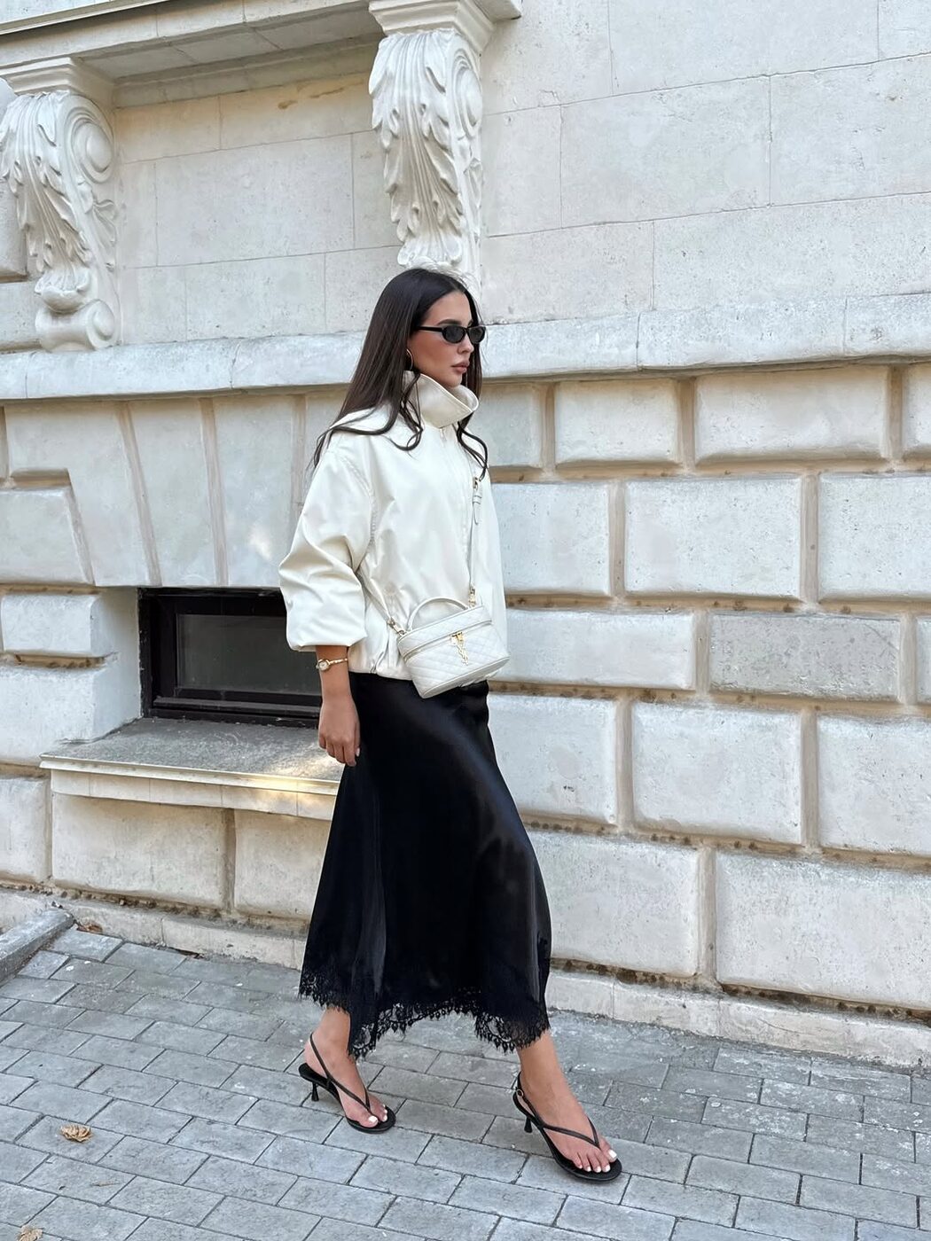 바람막이 재킷을 입는 묘미는 서로 다른 무드의 아이템을 믹스&매치할 수 있다는 점이죠. 나일론 소재의 아우터와 레이스 장식이 덧대어진 새틴 스커트의 조합처럼 말이죠. 여기에 샌들 힐, 포멀한 디자인의 크로스 백까지 더하니 활동성까지 챙긴 드레시한 룩이 완성되었습니다.