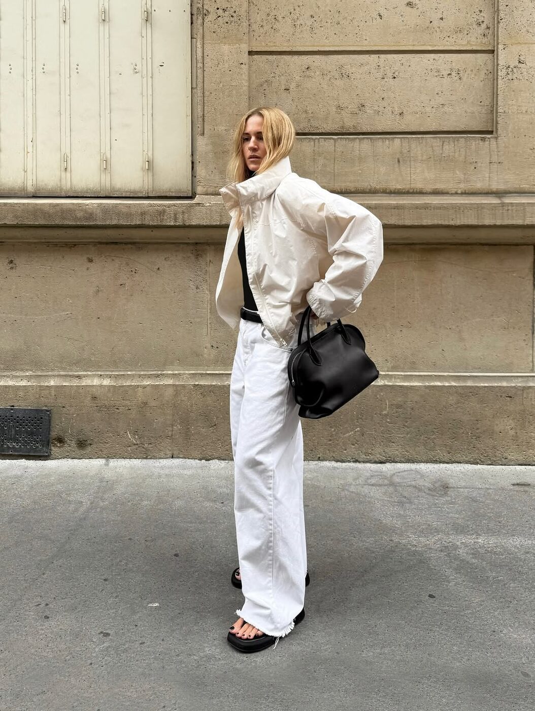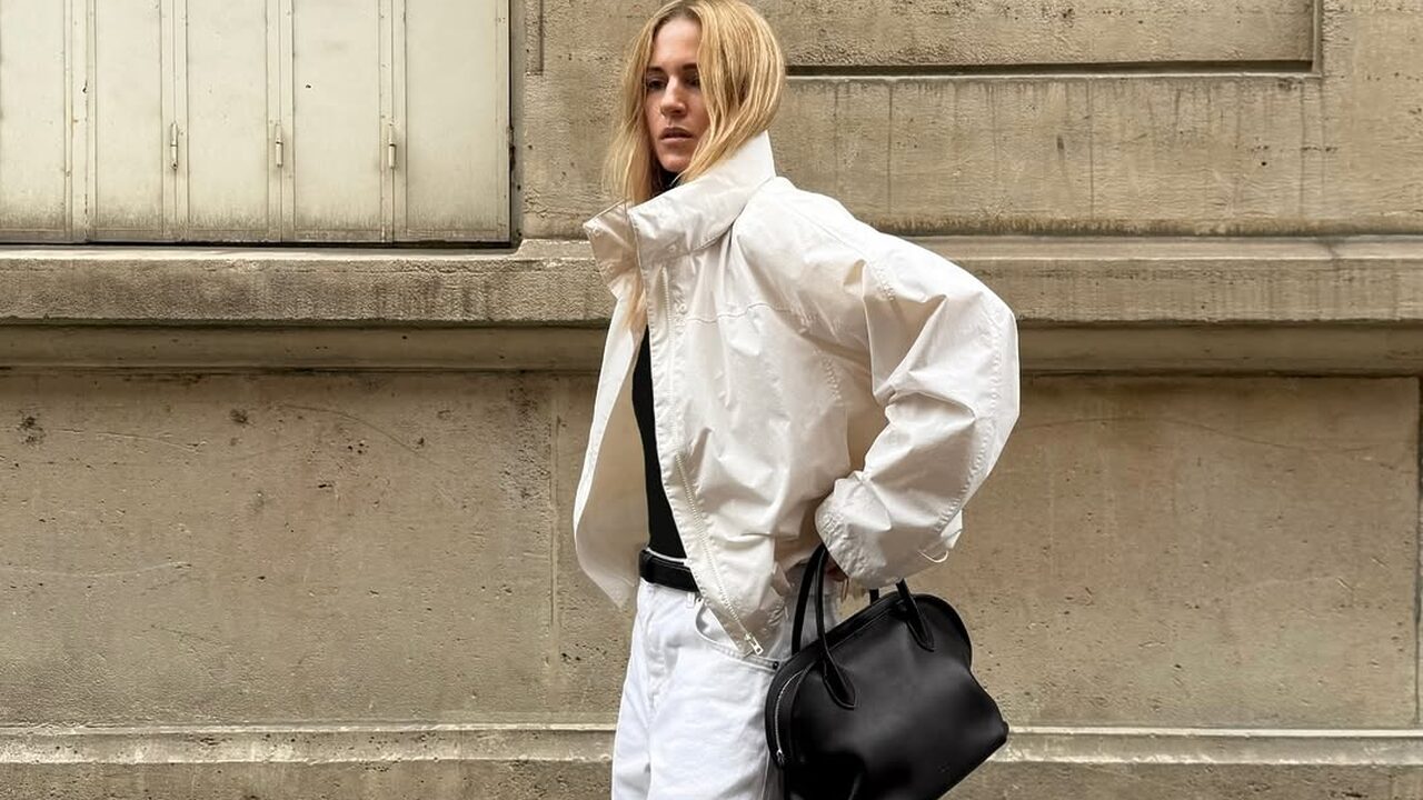 바람막이 재킷을 이용해 캐주얼하면서도 럭셔리한 터치를 더하는 방법! 바로 블랙&화이트 무채색 조합의 담백한 옷에 포멀한 액세서리를 더하는 것입니다. 애써 힘들이지 않아도 시크한 분위기를 연출할 수 있죠.