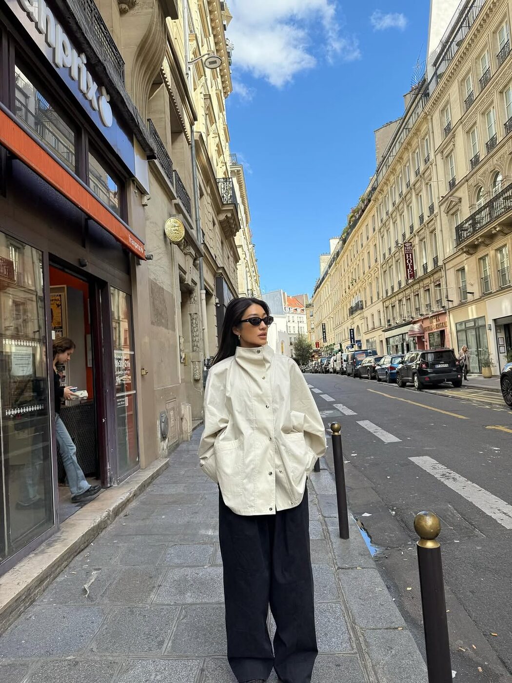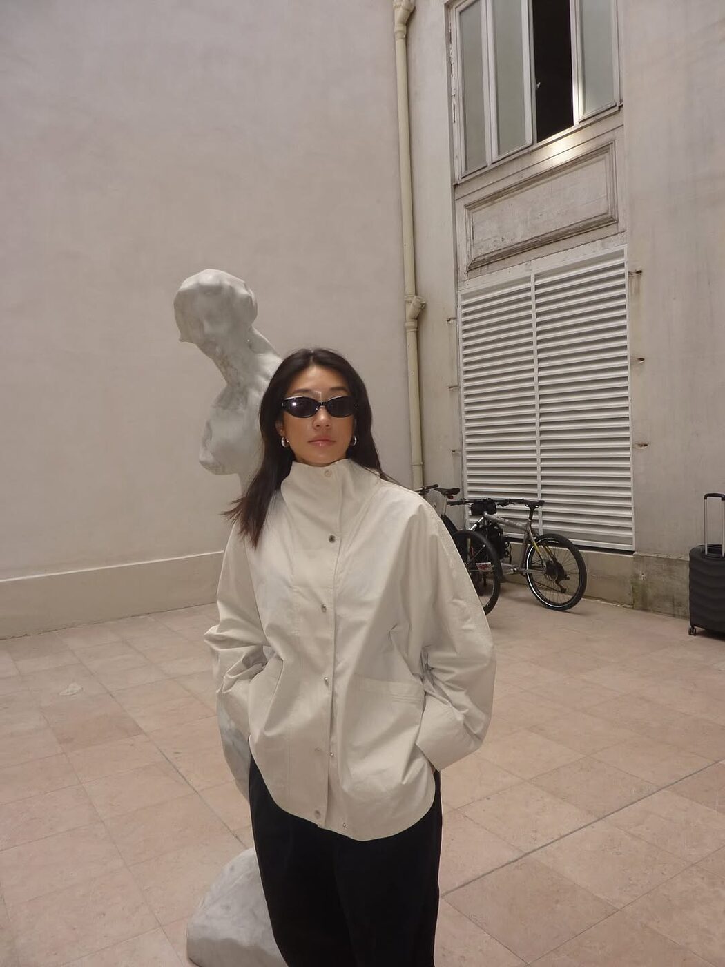 바람막이의 장점 중 하나는 바스락거리는 얇은 소재여서 실용성이 높은 아이템인 동시에 실루엣이 무너지지 않는 디자인을 고른다면 힘 있는 룩을 연출할 수도 있죠. 루즈하게 떨어지는 실루엣의 재킷과 와이드 팬츠를 매치한 페기 구의 일상복이 이런 멋스러움을 잘 보여주죠.