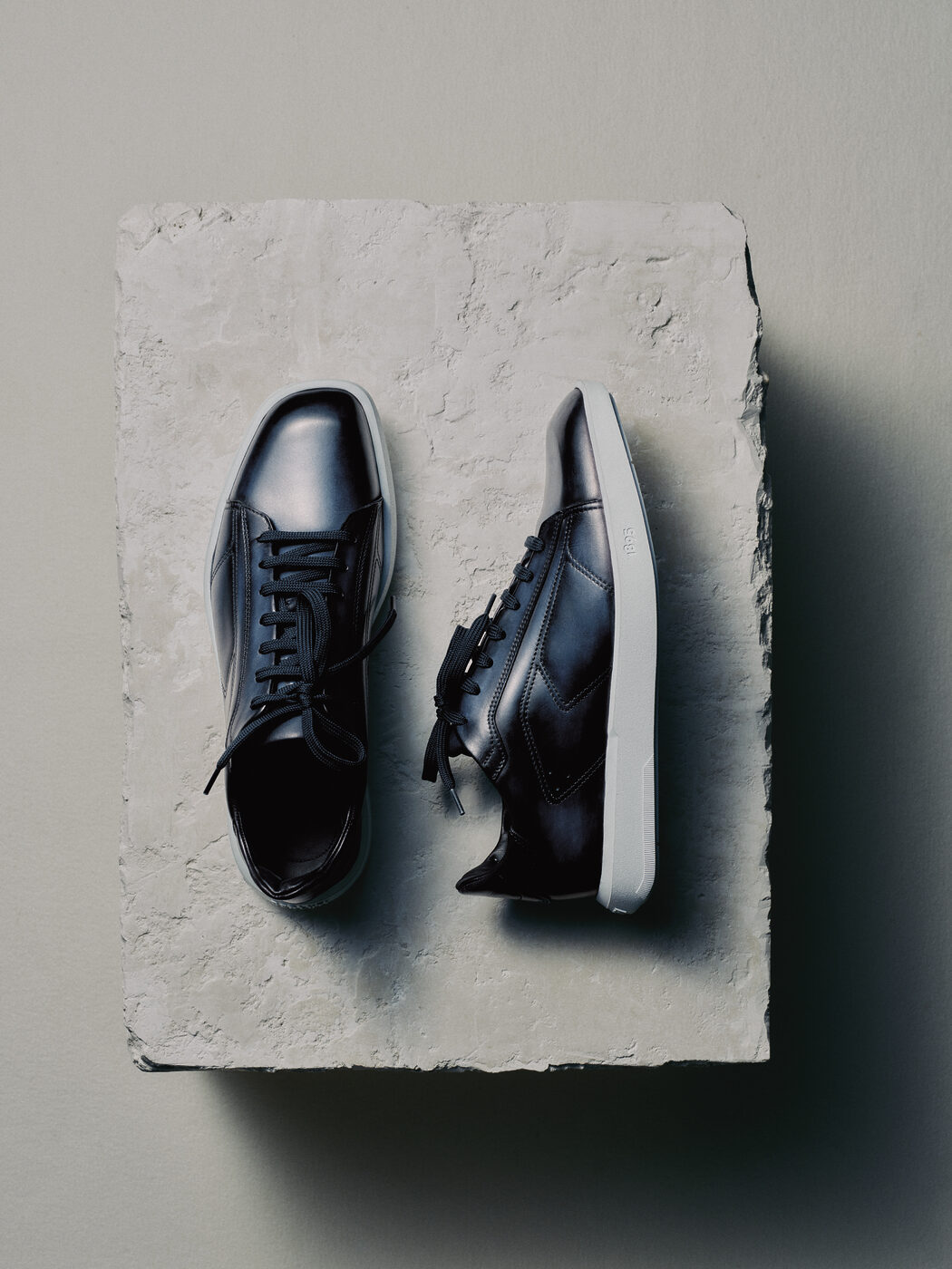 슈즈는 벨루티의 정체성 그 자체다. 19세기 말, 당시 창의적 예술이 융성하던 파리에서 슈메이커로 경력을 시작한 벨루티의 창립자 알레산드로 벨루티는 파리만국박람회에서 선보인 슈즈로 유럽 상류층을 비롯한 많은 사람의 열광과 찬사를 받으며 이름을 알렸다. 그 명성에 힘입어 1895년 그는 현재 메종의 상징이라 할 수 있는 알레산드로(Alessandro) 레이스업 슈즈를 세상에 선보였고, 이는 벨루티라는 장대한 이야기의 첫 장이 되었다. 메종은 알레산드로를 시작으로 비스포크 슈즈 제작을 위한 디메저(Demesure) 컬렉션을 본격적으로 확장하기 시작했다. 오랫동안 축적해온 장인들의 탁월한 기술력과 독보적인 창의력을 바탕으로 지금까지도 새로운 모델을 계속해서 출시 중이다. 최근 벨루티의 슈즈에 새로운 가지가 뻗어 나왔는데, 바로 몽타보(Mont-Thabor) 슈즈다. 파리 몽타보 거리의 첫 번째 벨루티 부티크에 바치는 헌사이자 메종의 헤리티지를 기념해 탄생한 슈즈로 각진 실루엣과 은은한 블랙 톤이 특징이다. 벨루티 장인들은 1,000여 가지 블랙 색조를 구분하는 과정을 거쳐 퐁당(Fondant), 아틀란타이드 (Atlantide), 스카라비(Scarabée) 세 가지 블랙 컬러를 탄생시켰다. 이후 퍼레이드, 알토 모델 등이 더해졌고, 2019년에는 당시 크리에이티브 디렉터였던 크리스 반 아쉐가 기존에 없던 모델인 스니커즈 ‘스텔라(Stellar)’를 선보였다. 이번 시즌 역시 전통을 계승하며 현대성을 반영한 신작 스니커즈를 공개해 큰 주목을 받았다.