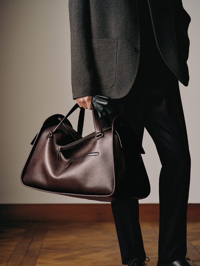 슈즈 다음으로 메종의 중요한 가지로 자리매김한 가죽 제품. 그중 메종의 새로운 대표 라인인 페리플(Périple) 백은 일상과 여행 어디서나 함께할 수 있는 가방이다. 20년 전 처음 선보인 가방 라인인 ‘주르 라인’이 우아한 남성들의 클래식 아이템으로 자리 잡았다면, 새롭게 등장한 페리플 백은 그 전통 위에 레더를 제작하는 기술력을 더해 한 단계 성장한 메종의 장인 정신을 보여준다. 풀 그레인 베네치아 소프트 레더의 내구성과 옥스퍼드 슈즈 제법에 서 착안한 어셈블리 방식은, 장인의 손길을 통해 하나의 퍼즐처럼 완성된다. 이번 출시를 시작으로 메신저백, 폰 파우치, 위켄더 트래블 백 등으로 확장될 예정이다.