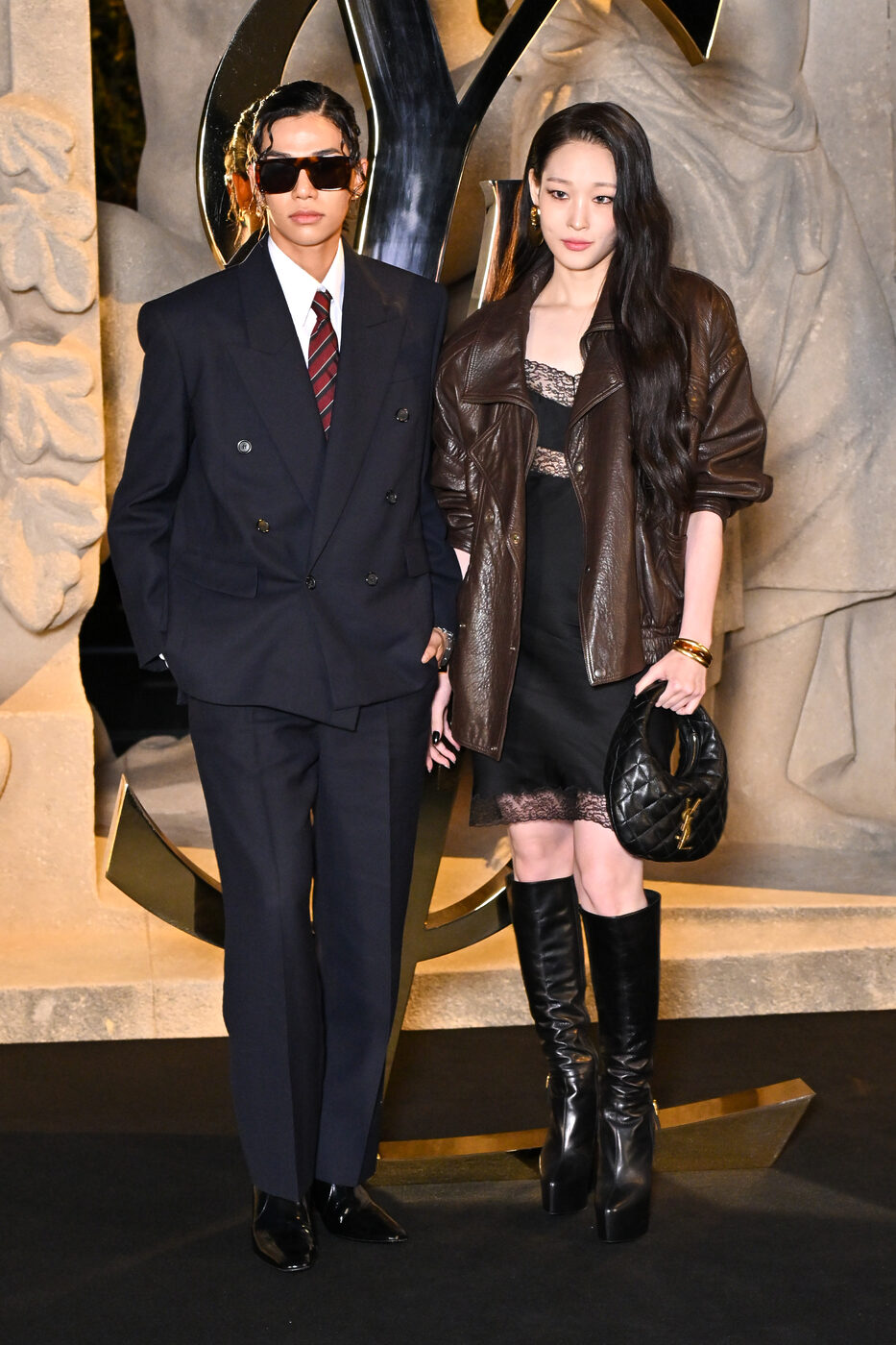 첫 시작은 생로랑을 찾은 애니와 타잔이었습니다. 먼저 애니는 로맨틱한 파리의 밤과 잘 어울리는 슬립 드레스에 오버사이즈 레더 재킷으로 글래머러스한 실루엣을 연출했죠. 그녀의 파트너 타잔은 파워 숄더가 돋보이는 더블 브레스티드 슈트에 타이까지 갖춘 젠틀한 모습으로 나타났는데요. 애니와 타잔 모두 80년대 파리의 레트로한 파워 드레싱을 현대적으로 재해석한 이번 생로랑의 테마에 딱 맞는 룩으로 등장해 성공적인 파리 패션 위크 데뷔를 알렸습니다.